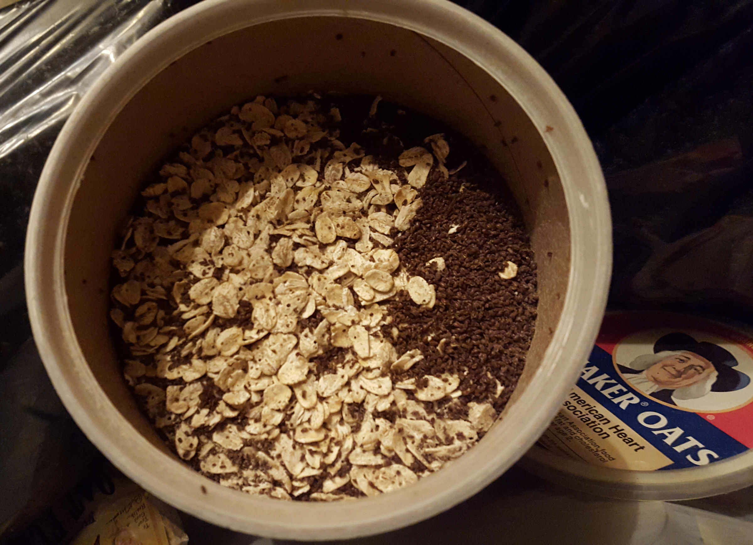 Then common sense returned and I tabled Plan A for the time being. I showed the box to Anne, who confirmed that, no, that’s not what oats look like in any civilization. Not even artisanal oats, which I’m sure are a thing somewhere. Behind our backs this cardboard cylinder of healthy carbs had transmogrified into a surprise vermin farm.