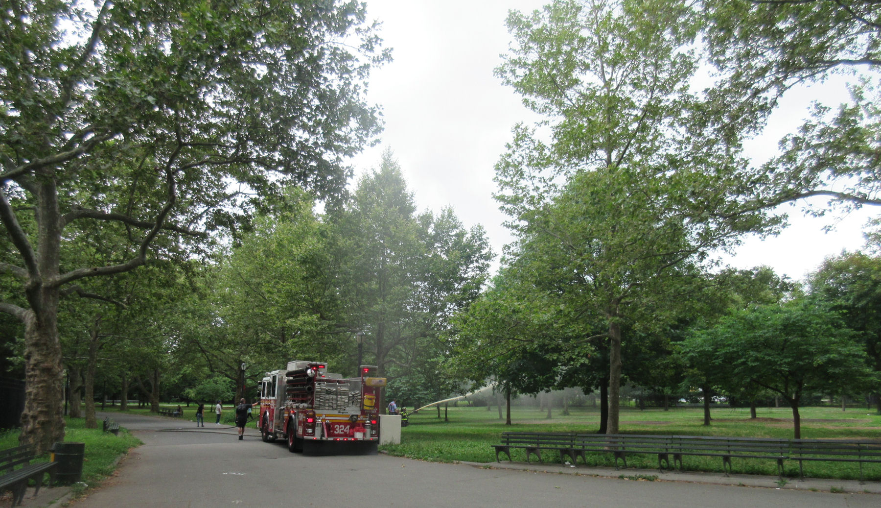 As we approached the zoo, we passed the firefighting crew of Engine 324 spraying down the grass as some sort of service or function beyond our need-to-know scope. Or maybe just because summer.