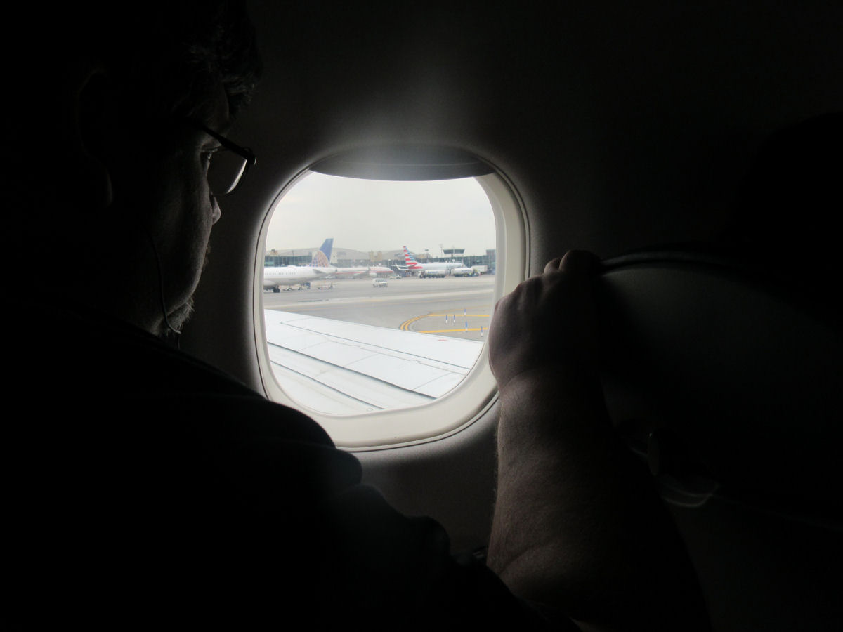 Years later, boarding began on time. Takeoff, on the other hand, didn’t. The minutes dragged as our plane idled, then rolled around, then idled more, then cruised a wee faster and got our hopes up, then turned around and did nothing. And so on. Out the window we couldn’t see much going on except other straggling planes sharing the tarmac. We assumed business as usual.
