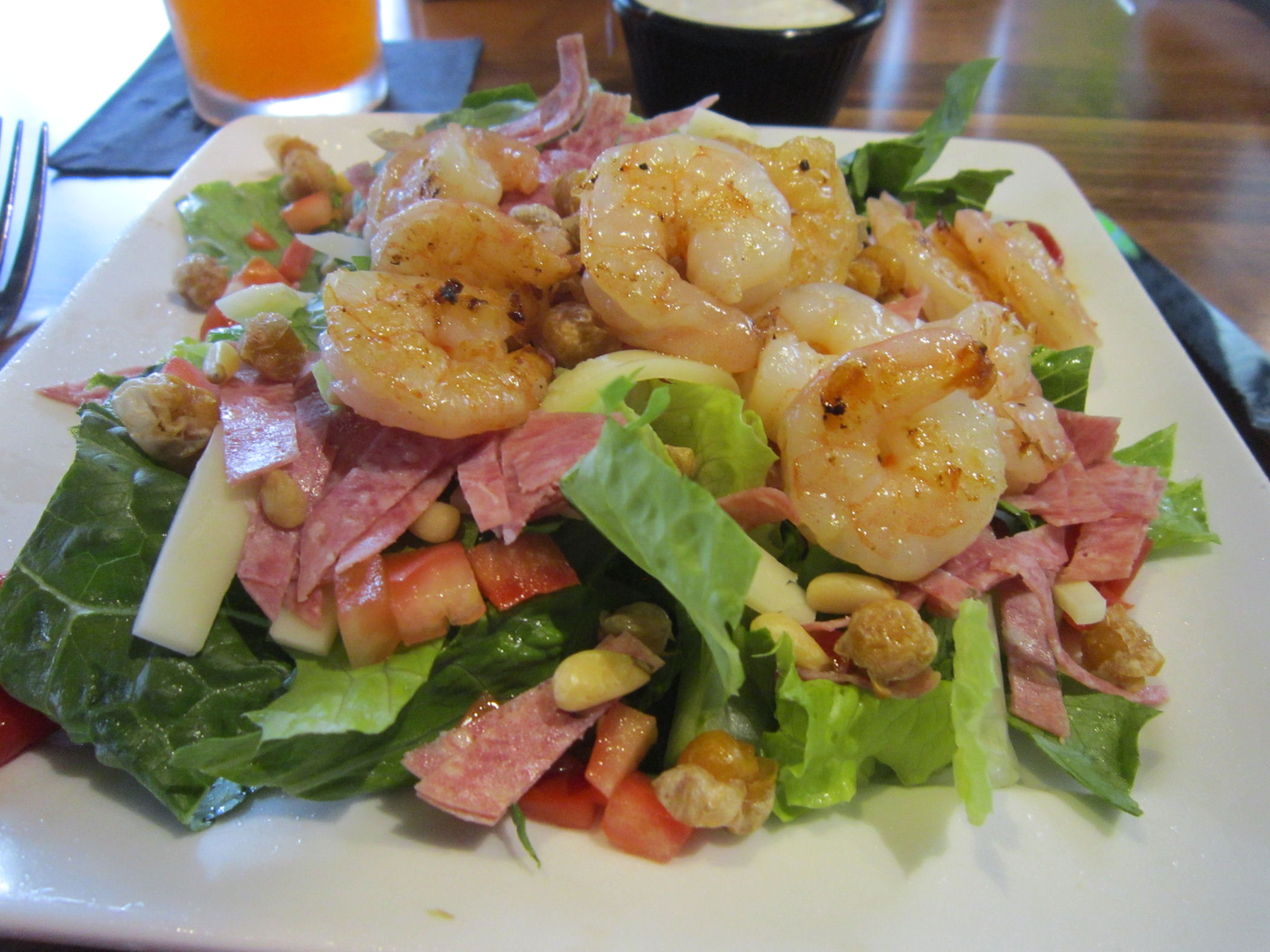 Her meal had the deceptively simple name of “Chopped Salad” — salami, provolone, pickled peppers, crispy garbanzo beans, pine nuts, tomatoes, and oregano vinaigrette. For a few bucks extra she had them toss on a handful of shrimp because birthday.