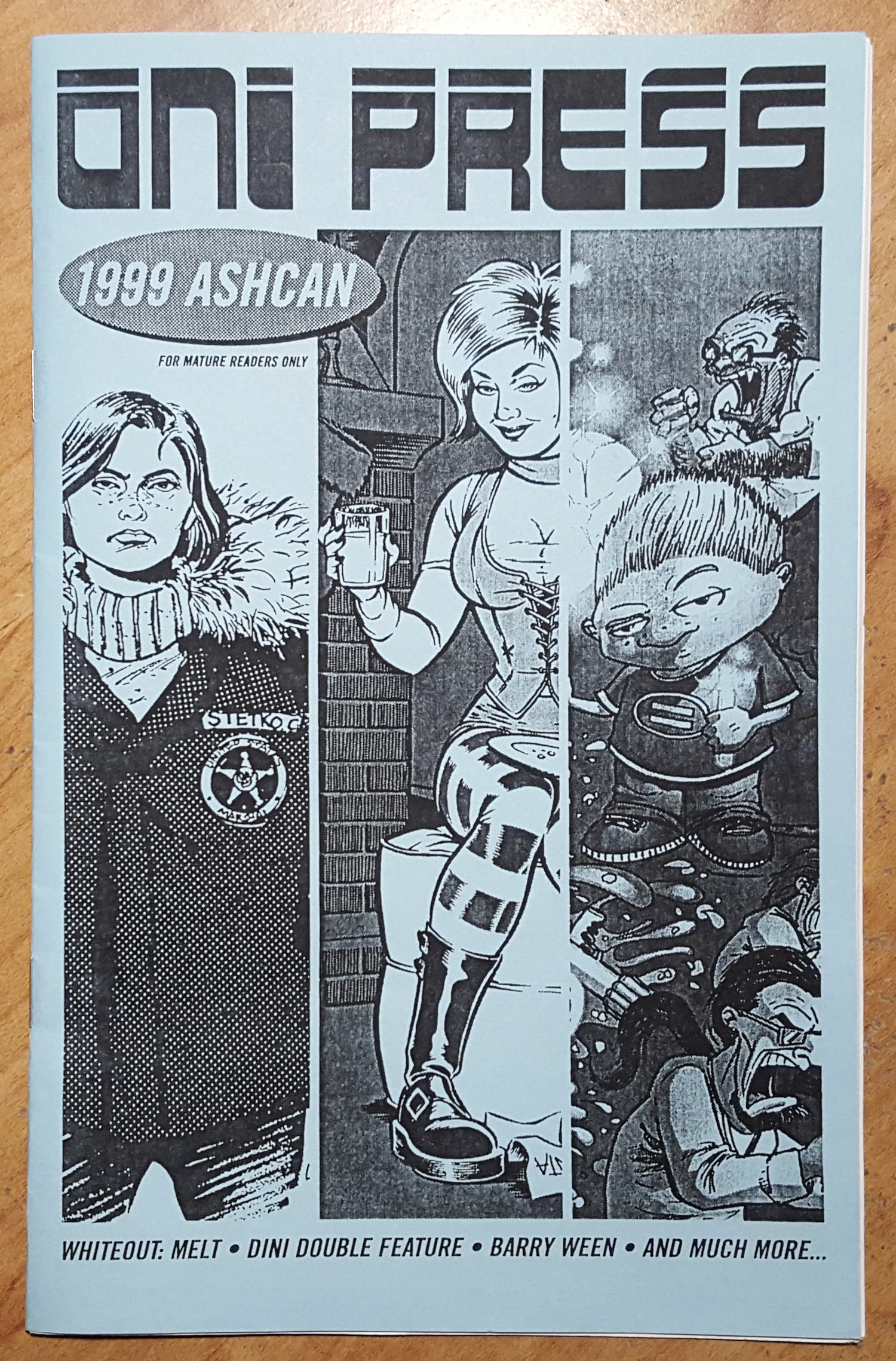 * Young upstart Greg Rucka, whose Whiteout I’d bought at the Oni Press booth and devoured while in the CBLDF booth line, and left me itching to get to the sequel. He’d recently been hired to begin his renowned Detective Comics run, so I found him seated at the DC booth next to Robin writer Chuck Dixon’s long, long line. After signing Whiteout he directed me over to Artists Alley, where co-creator Steve Lieber cosigned and sketched in it for me.