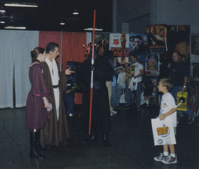 The program lists another dozen or more comics talents we missed. Curiously, despite its glossy pages and non-mimeographed nature, upon closer examination the same program is shoddy and incomplete, listing none of the actors except Ray Park, providing a map of the show floor with nothing labeled, but taking care to devote a space to quasi-cosplay quasi-guest Keep-Squeezin’-Them-Monkeys Lad. (Hey, don’t give me that look. I never worked for Wizard.)