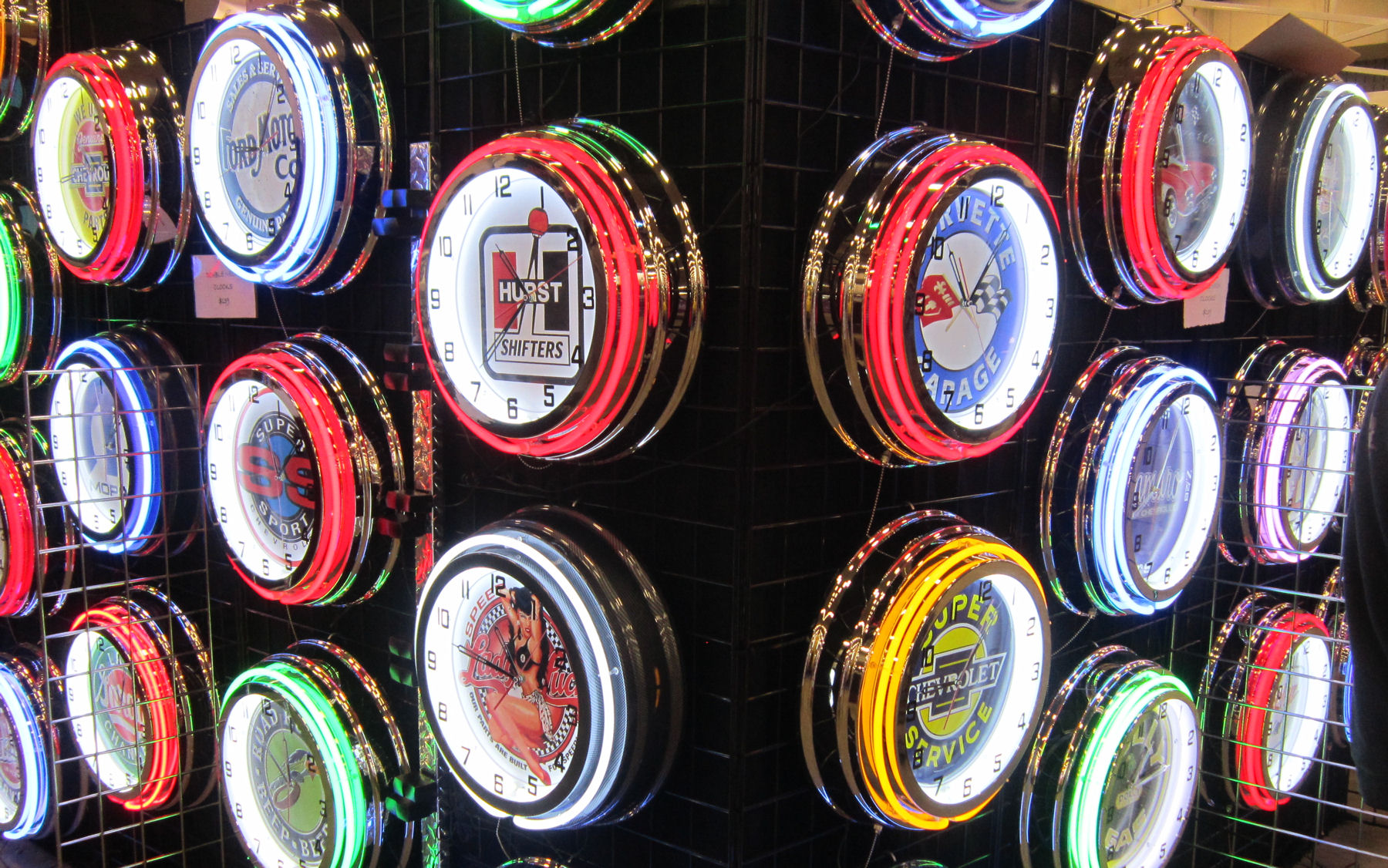 For some attendees, “automotive accessories” can also be a term meaning “car stuff for around the house”, such as these clocks featuring motor oil logos, Bettie Page, and other symbols car fans love.