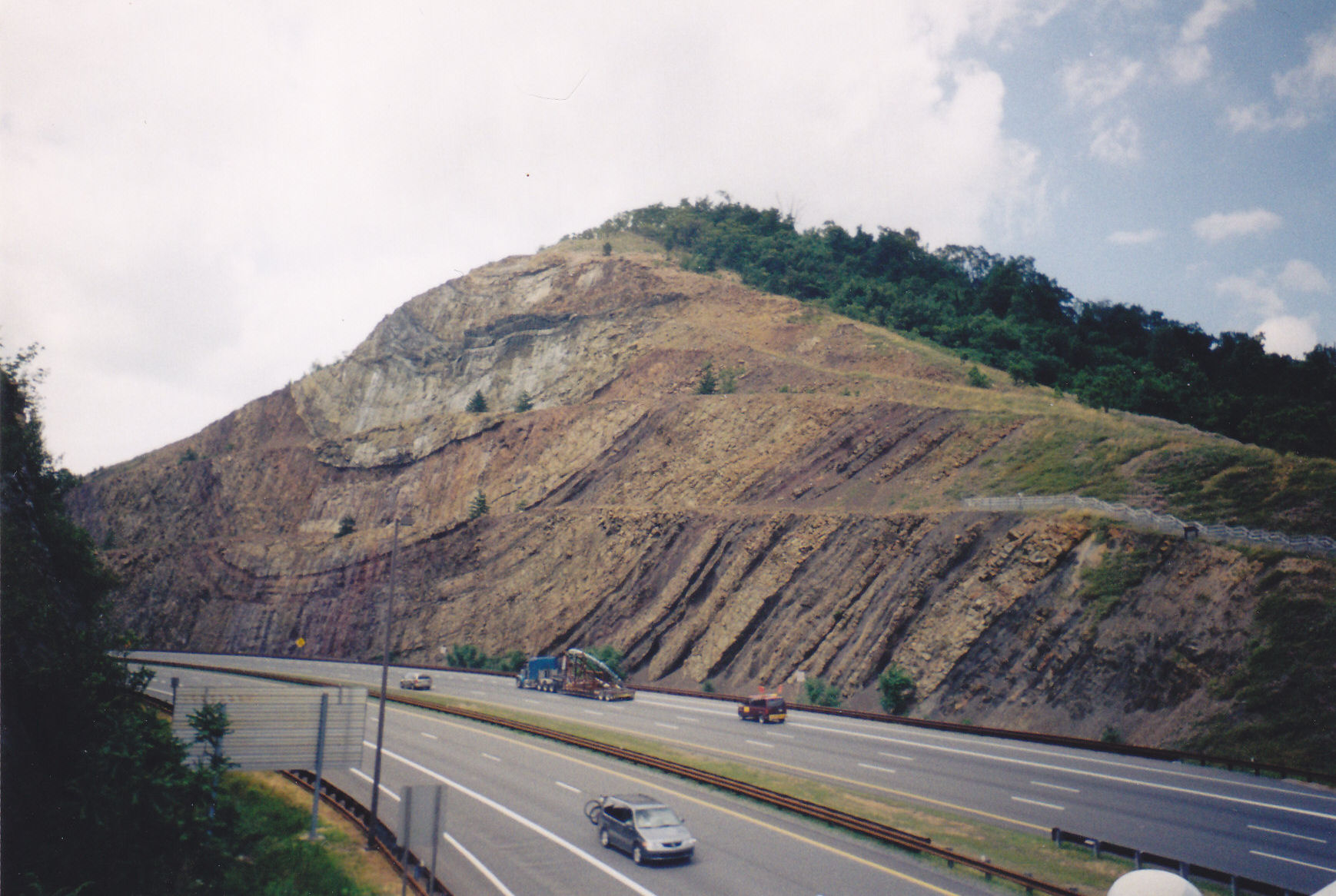 We lucked into one nifty sight along the way. Nestled among the endless rolling greenery was Sideling Hill, a ridge in the Alleghenies with an interstate carved through one section of it. We stopped at their welcome center, viewed their exhibits, and walked up and down the ridge for a while to stretch our legs and see geology formations up close. This was closer to the true mountainousness we’d envisioned.