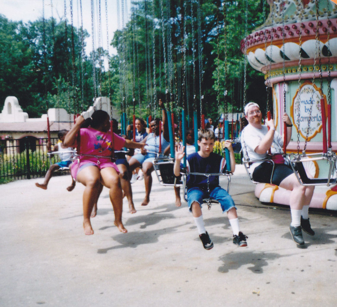 Early in the day, a happy-ish father/son duo prepares for adventure on the Flying Carousel. Kings Island has swings just like these, of course.
