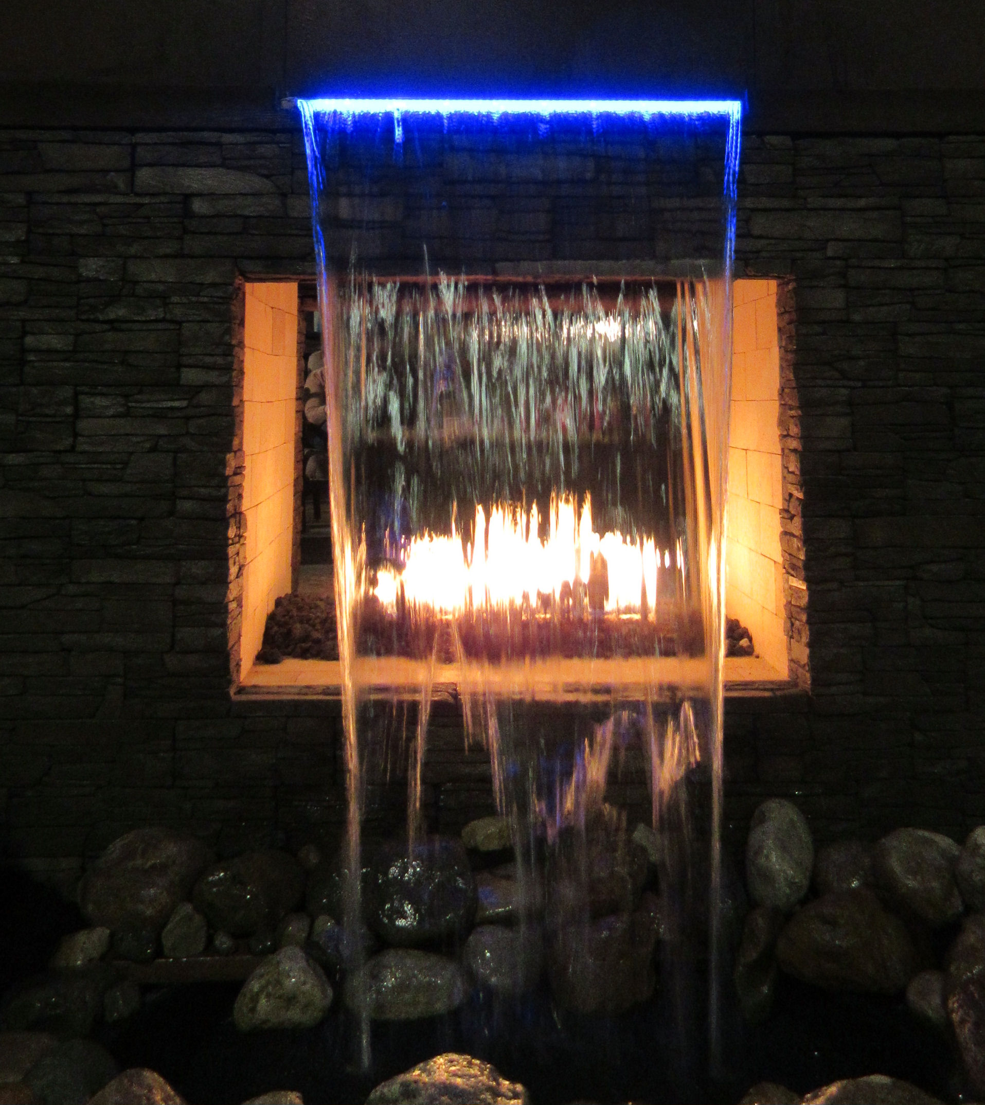 You could install an outdoor fireplace with a waterfall in front of it instead of a screen and a flue.