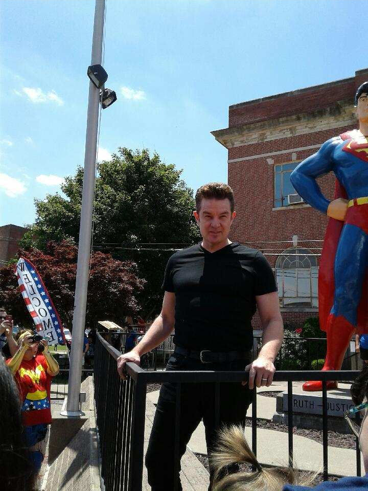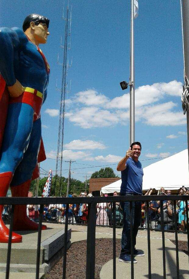 Dean Cain, onetime Smallville super-villain, greets starstruck fans in a photo-op at the town’s world-famous Superman statue.