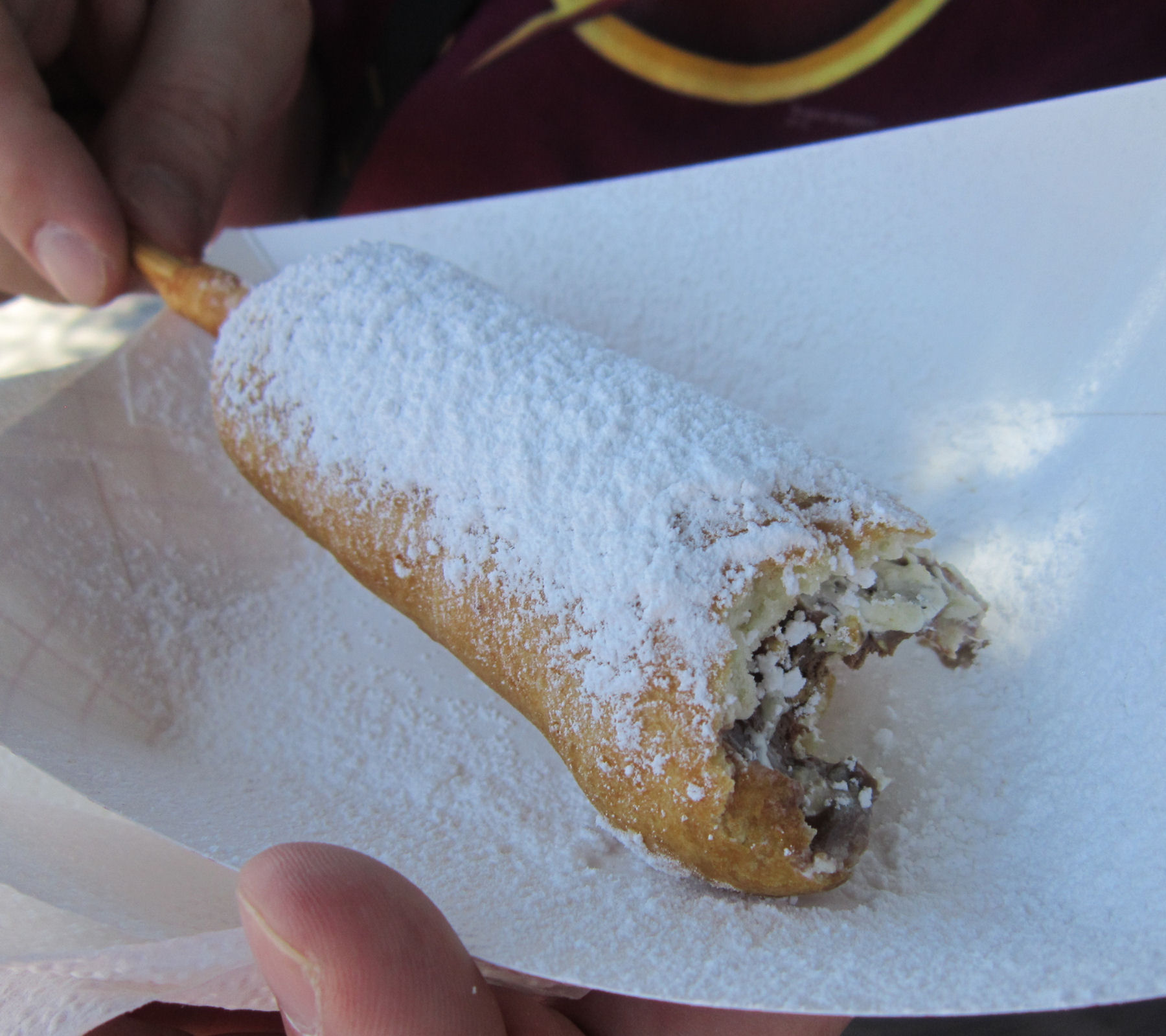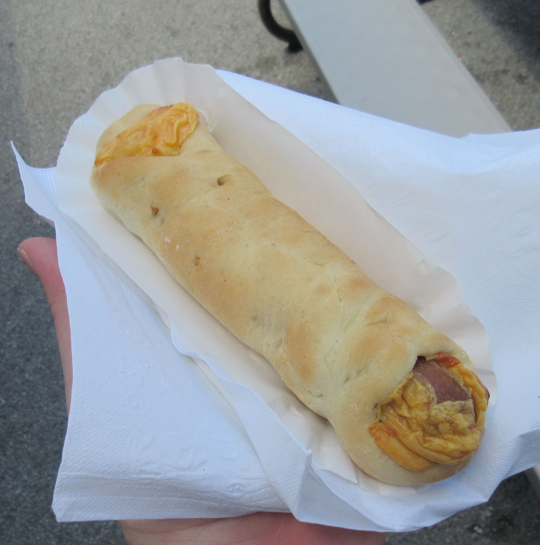 A much simpler but more successful use of protein was the Snuggle Dog. It’s like a pig in a blanket, but giant-sized. Take one jumbo hot dog; wrap it in cheese; cover it all in professional bread dough; bake until awesome. The same stand also offered hamburgers on freshly homemade buns and warm cinnamon rolls as a fine breakfast alternative for any early birds who were’t feeling the old Hardee’s across the block.