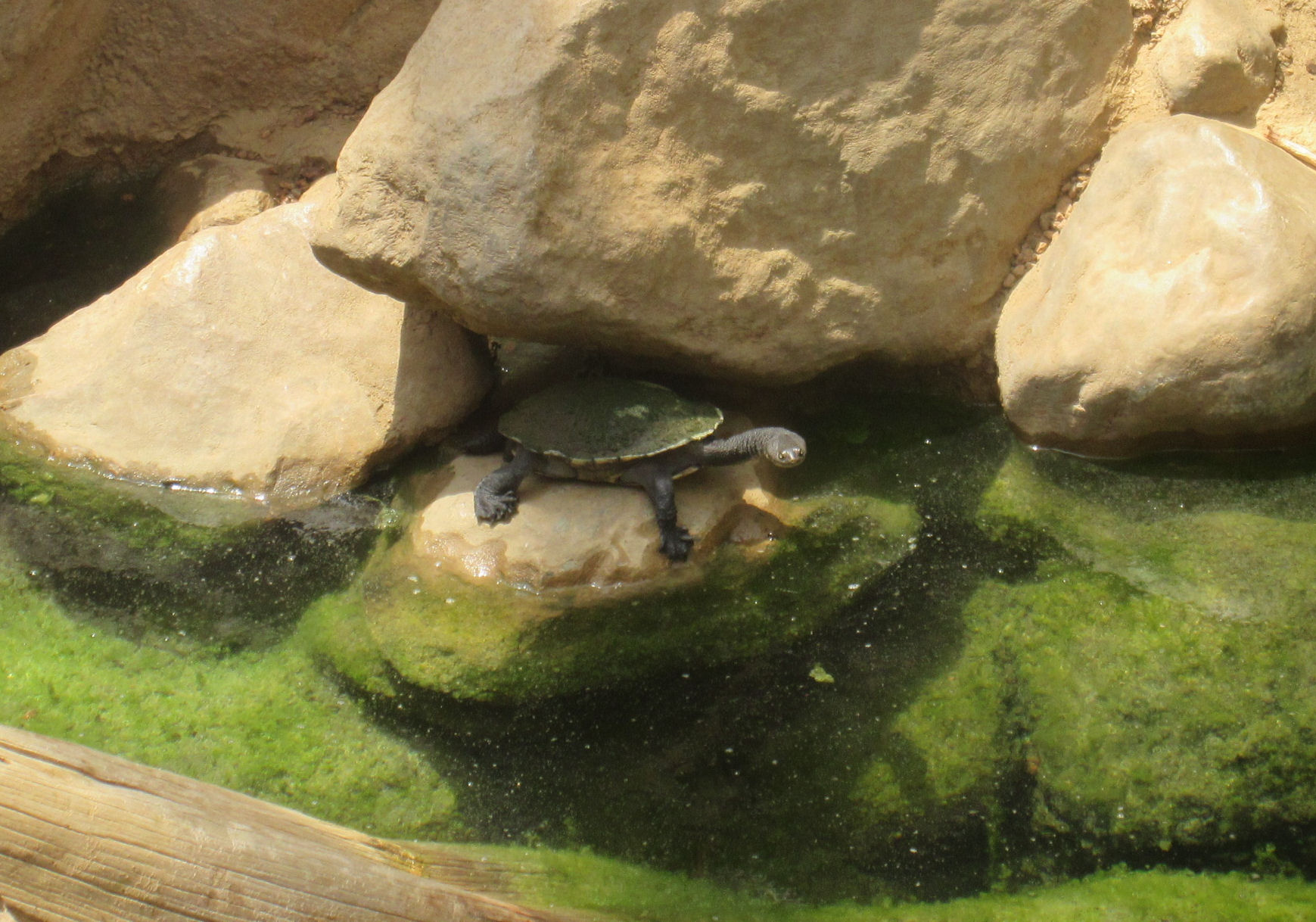 The long-necked turtle is on the same page, but has the added advantage of slightly better scenery to enjoy.