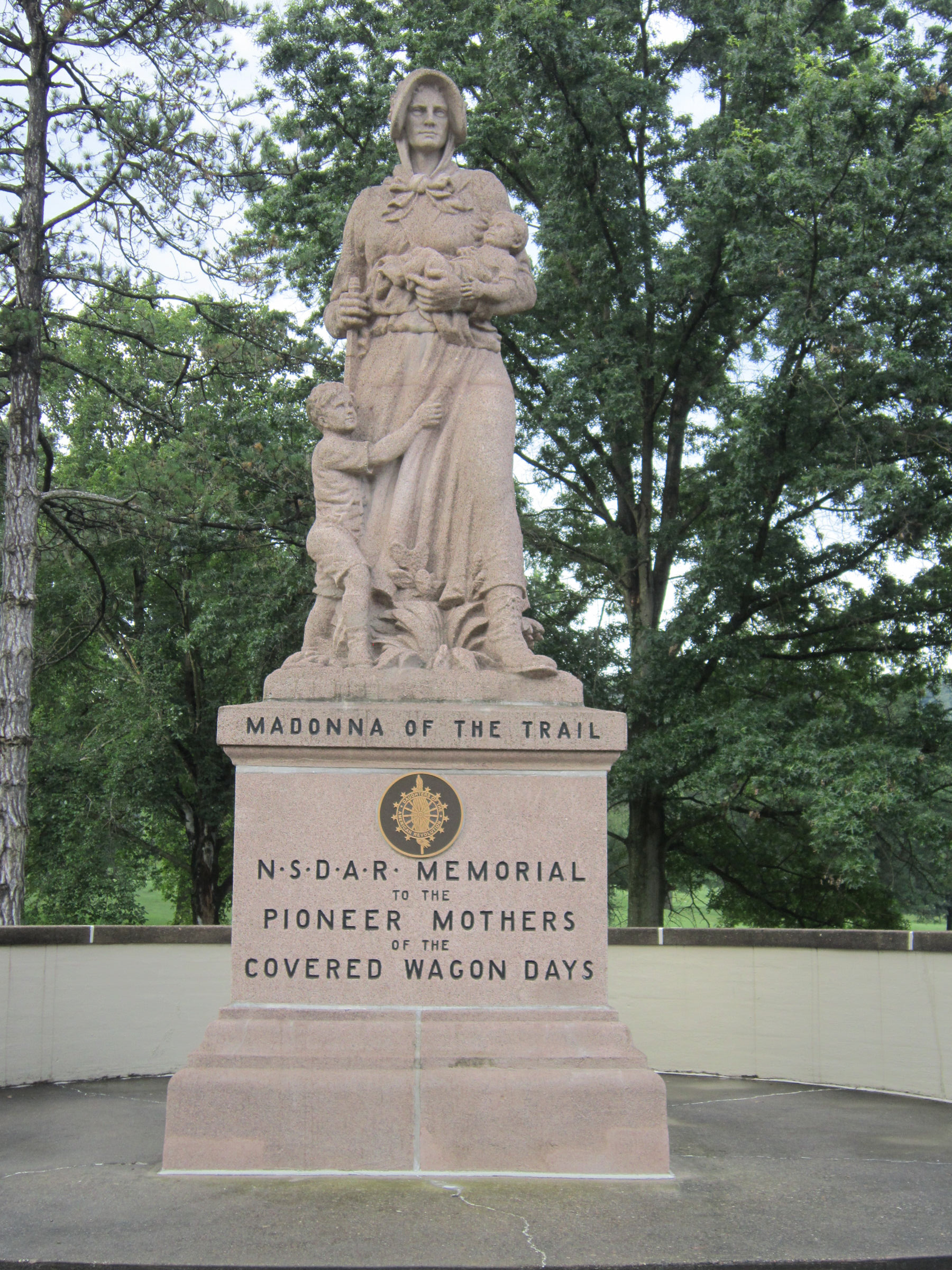 Within that West Virginia sliver stands a woman we’ve seen before: the Madonna of the Trail. Between 1928 and 1929 the Daughters of the American Revolution arranged for twelve identical statues to be placed along US 40, a.k.a. the National Road, from California to Bethesda, Maryland, in honor of the spirit of the pioneer woman and her contributions to frontier expansionism. Previously on MCC we’ve brought you pics of Madonnas of the Trail in Vandalia, IL; Richmond, IN; Springfield, OH; and faraway Lamar, CO. Wheeling’s own would be our fifth sighting of the twelve.