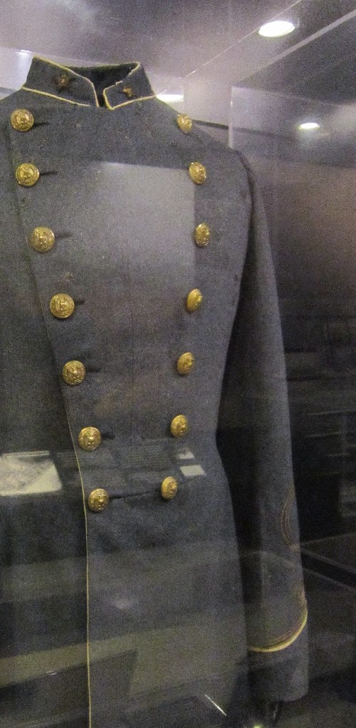 Officer’s coat belonging to Henry Kyd Douglas, then age 21, youngest member of General Stonewall Jackson’s staff. Subsequently captured at Gettysburg, Douglas would later practice law in Maryland and was part of an effort to relocate soldiers’ graves from Antietam to a dedicated Confederate cemetery in Hagerstown.