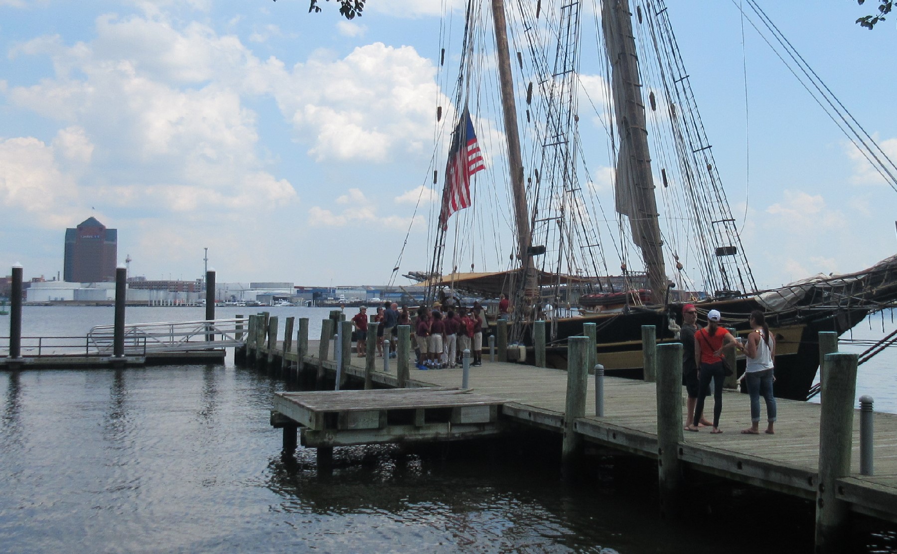 The water taxi stop at Fort McHenry had no posted schedule that we could find. We had no idea how long it would be till the next one would arrive to hasten us along to other parts of Baltimore. The long walk through and around McHenry had been more draining than we expected. We refilled our water bottles inside the visitors center and found shade near the water’s edge. At the dock was a watercraft that hadn’t been there when we arrived, an olde-tyme sailing ship idling while its crew busied themselves.