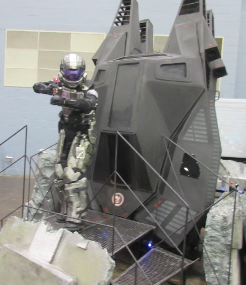 HALO-ish soldier exiting the VR machine, or giant video game booth, or working teleporter, or hair dryer for all I know.