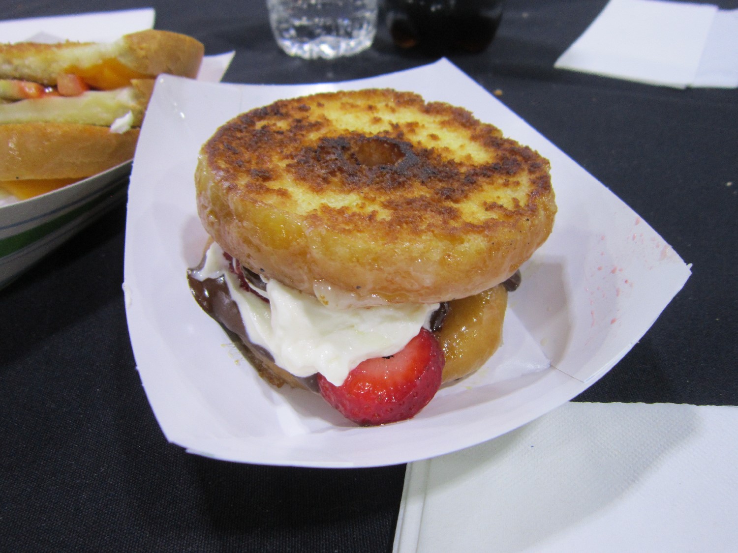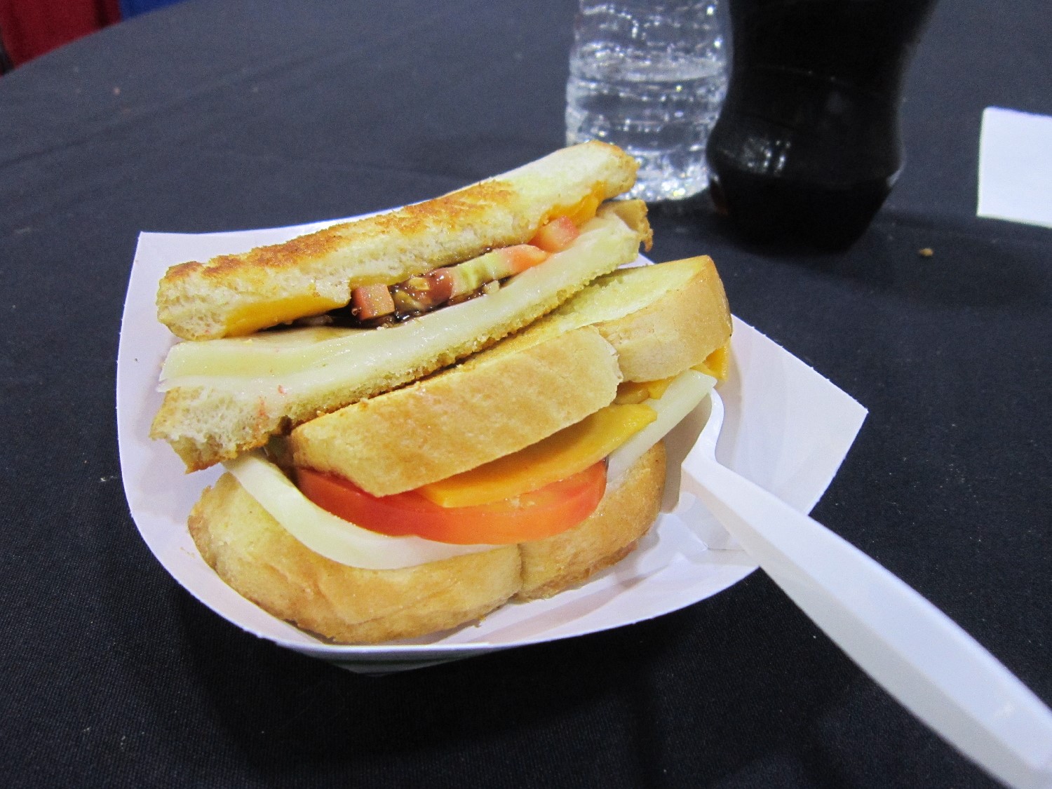 Speaking of food: CCE remains very nearly the only convention we’ve ever attended for which I’m genuinely eager to eat on the premises. In addition to local chains LaRosa’s Pizzeria and Skyline Chili, they also welcome the wondrous works Tom & Chee, a specialty grilled-cheese joint that also has a location twenty minutes from our house. This year their booth was a lot less prominent, stationed in a faraway section behind the northernmost aisle. We had no idea they were there till Anne went on a scouting mission and stumbled across them. As with last year’s upstanding lunch, we found ourselves duly satisfied and wish they catered every con ever.