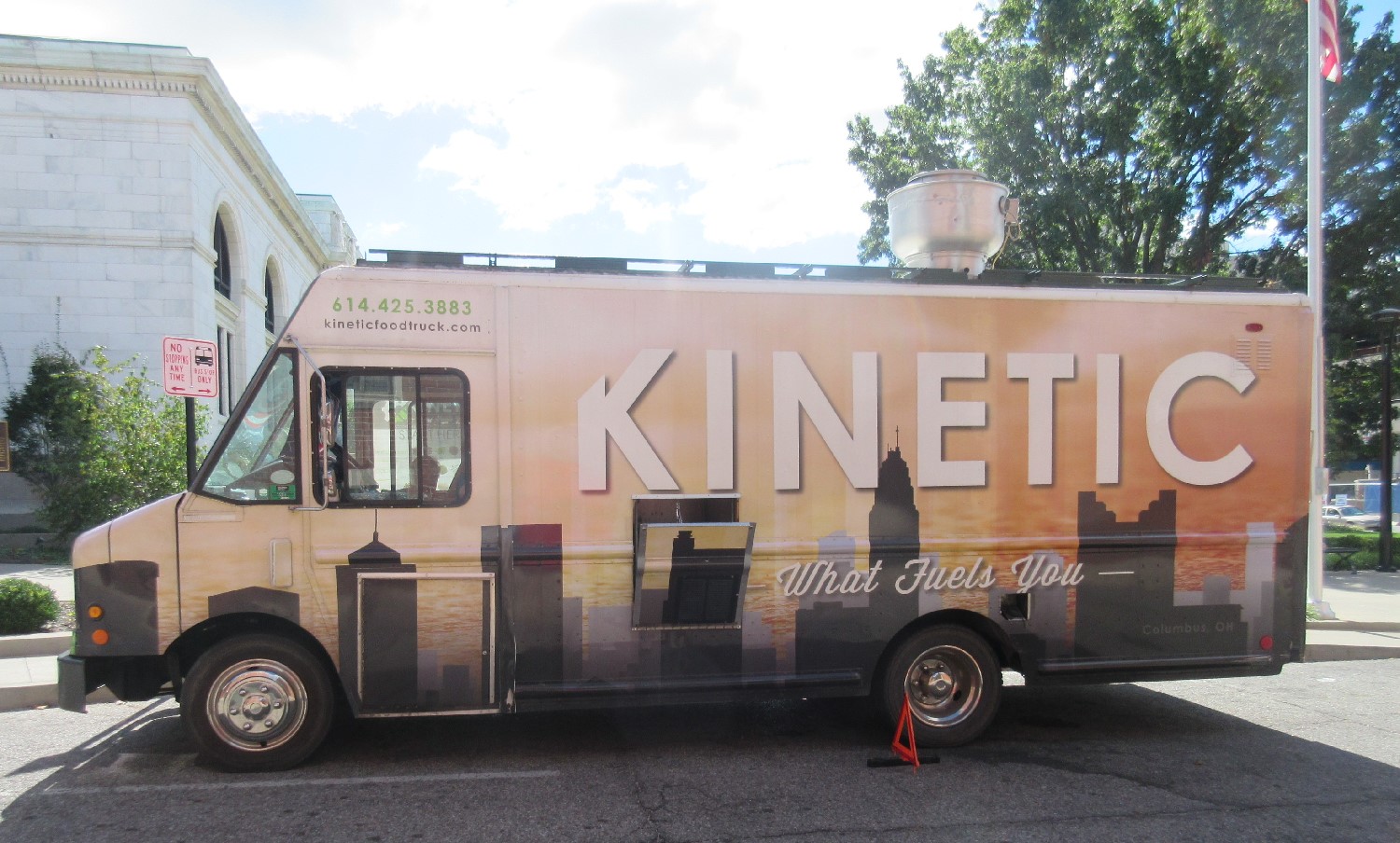 Shortly before 1:00 we ended our first tour of the aisles and made a relief stop at the car. We exited the library in hopes of catching lunch somewhere not too far away. Our answer and salvation was parked thirty feet from the front door: a food truck! Kinetic Food Truck was on site to save anyone and everyone from the iffy Google Maps results and from the unwanted overtures of the Subway down the street. Diners had their choice of chicken or vegetarian dollops served on either greens or grains with Baja, Caprese, or West Coast sauce-‘n’-veggies. For an extra four bucks I threw in a side of Brussels sprouts, roasted and drizzled with balsamic glaze. I normally hate Brussels sprouts and sincerely appreciate when a chef doesn’t just boil them and serve them plain and inherently disgusting.