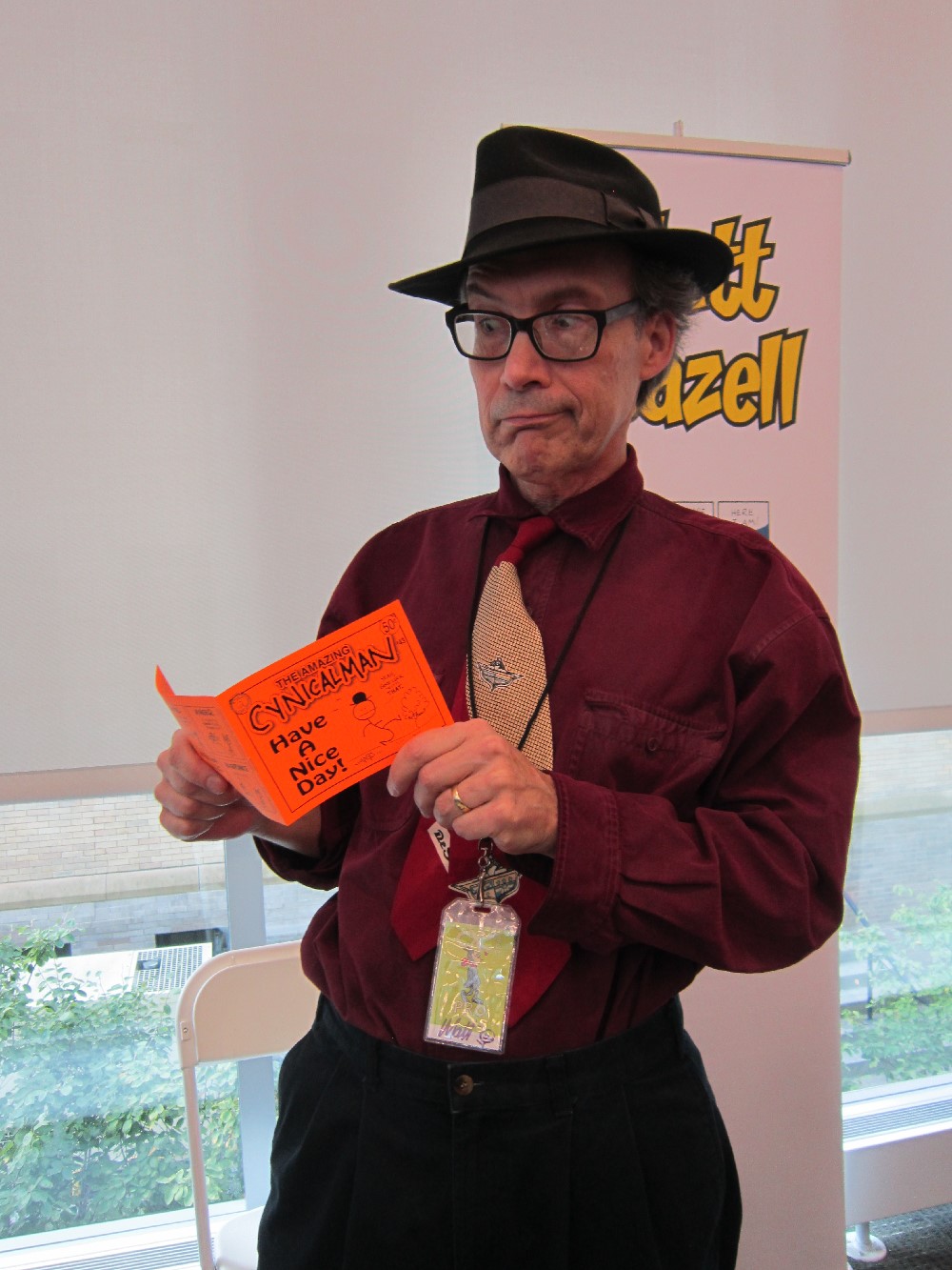 I was game for meeting new faces and hearing new voices, but two names in particular were on my Must List. More obscure of the two: Matt Feazell! Back in the ’80s he was a fine purveyor of stick-figure mini-comics starring his characters Cynicalman, Antisocialman, and a few others without “man” in their name. Readers of Scott McCloud’s sci-fi series Zot! were treated to his hilarious one-page lo-fi tales beginning with #11, including the mid-numbered #14½ in which Feazell took over an entire issue with nothing but stick figures. His eyes popped a little when he saw I’d brought my copy of his 1987 The Amazing Cynicalman reprint volume.