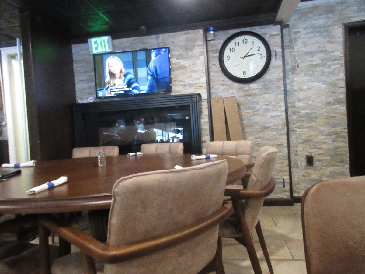 Amenities adjacent to our table included a dormant fireplace, fancy paneling, and daytime soap operas.