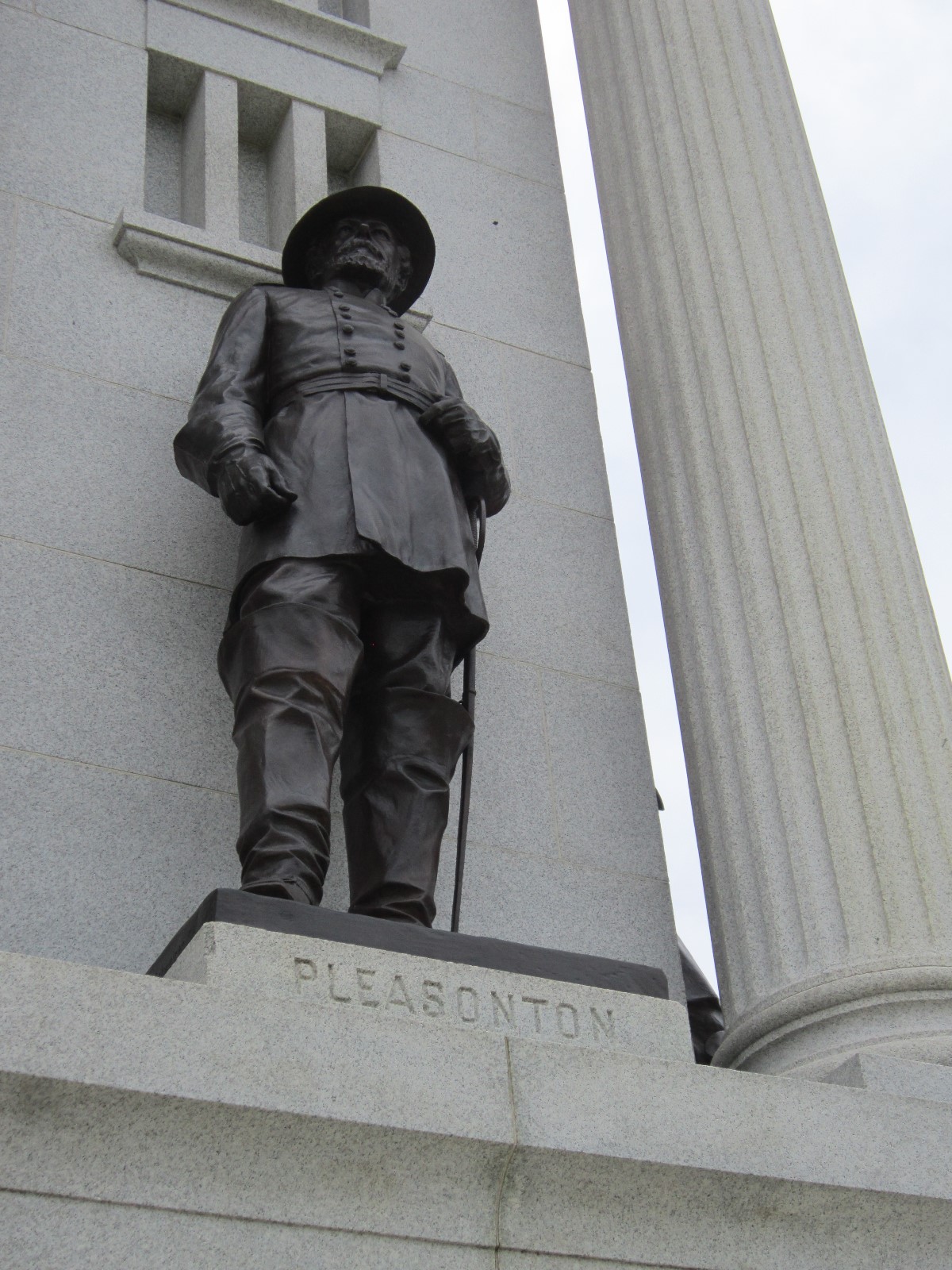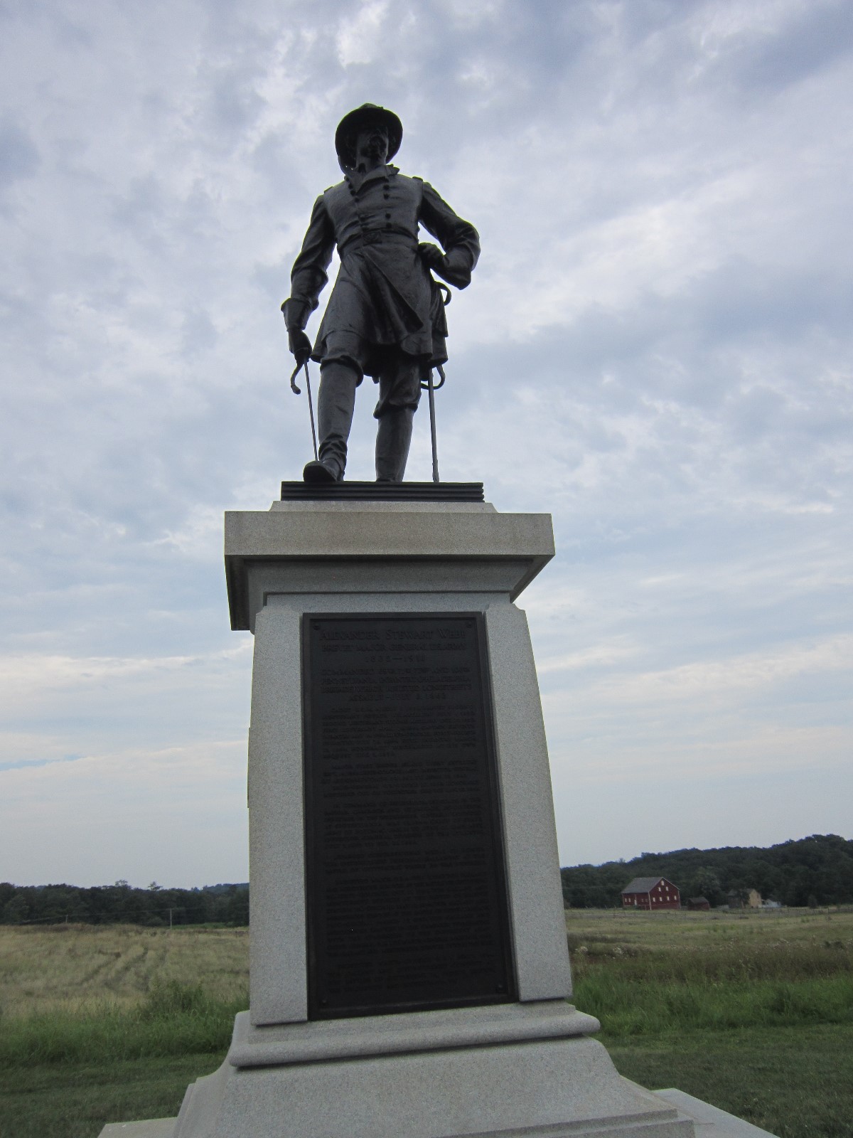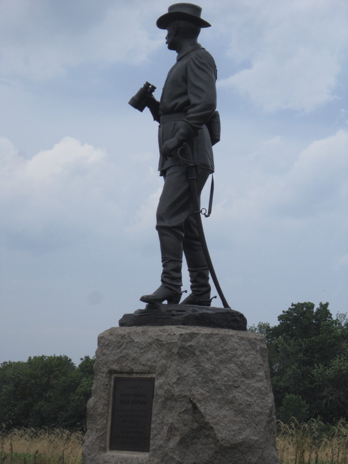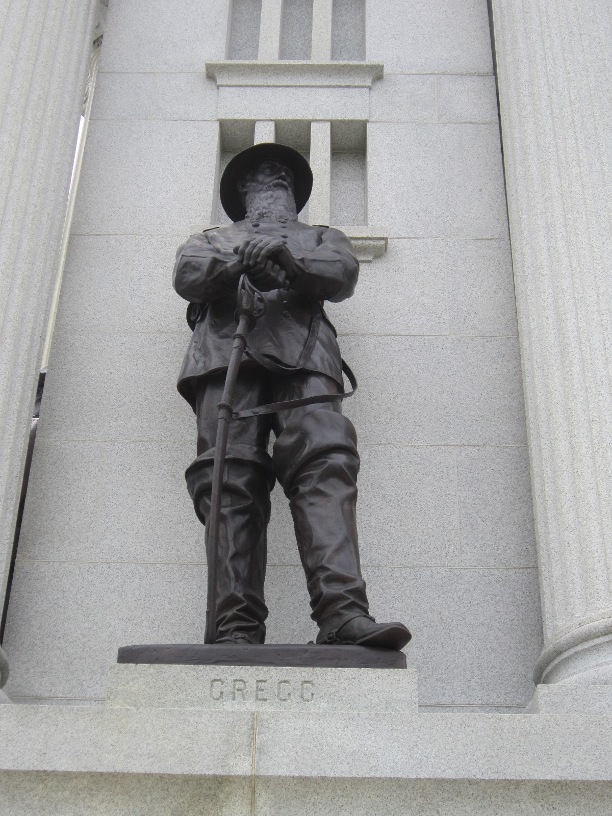 Standing guard on the other side of the Pennsylvania State Monument is General David McMurtrie Gregg, a cousin of Governor Curtin whose division fended off advances by an enemy division led by General J.E.B. Stuart. After the war, for a short time he served as US Consul to Prague under President Grant.