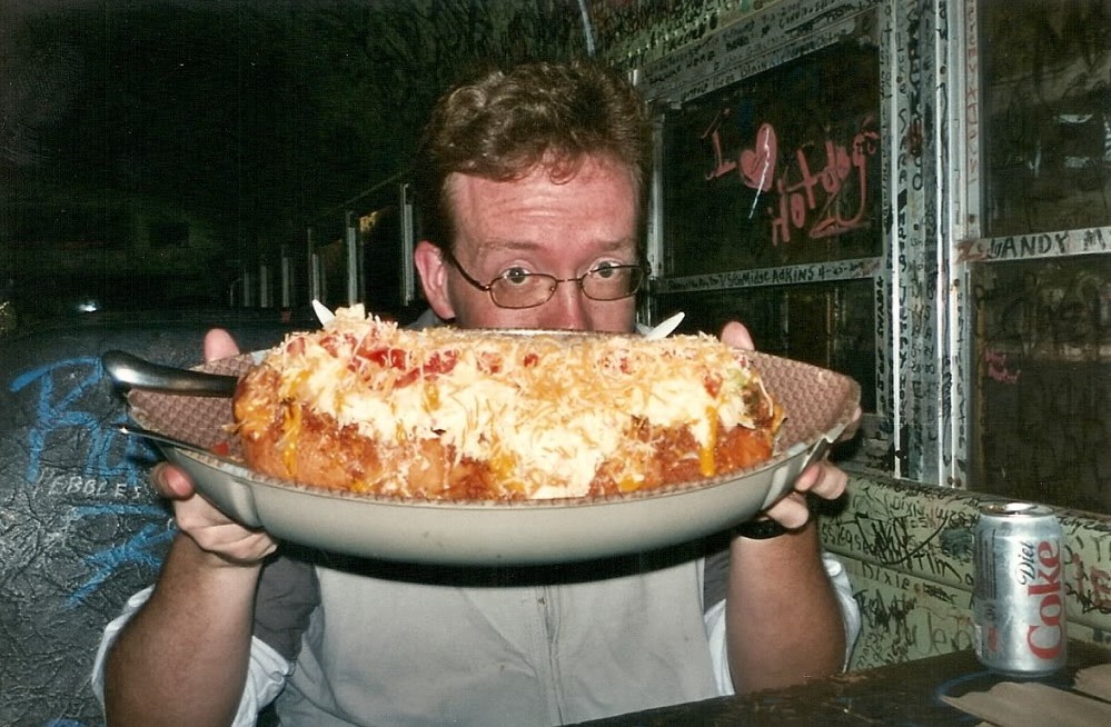 Among a selection of over three dozen menu items, the dog to end all dogs is called the Homewrecker. The deep-fried dog is fifteen inches long, couched in a bun twice as thick, and buried under shredded cheese, nacho cheese, chili, lettuce, cole slaw, mustard, ketchup, onions, peppers, tomatoes, and machismo. Weighing in at 3½ pounds and fifteen dollars, this was my challenger: