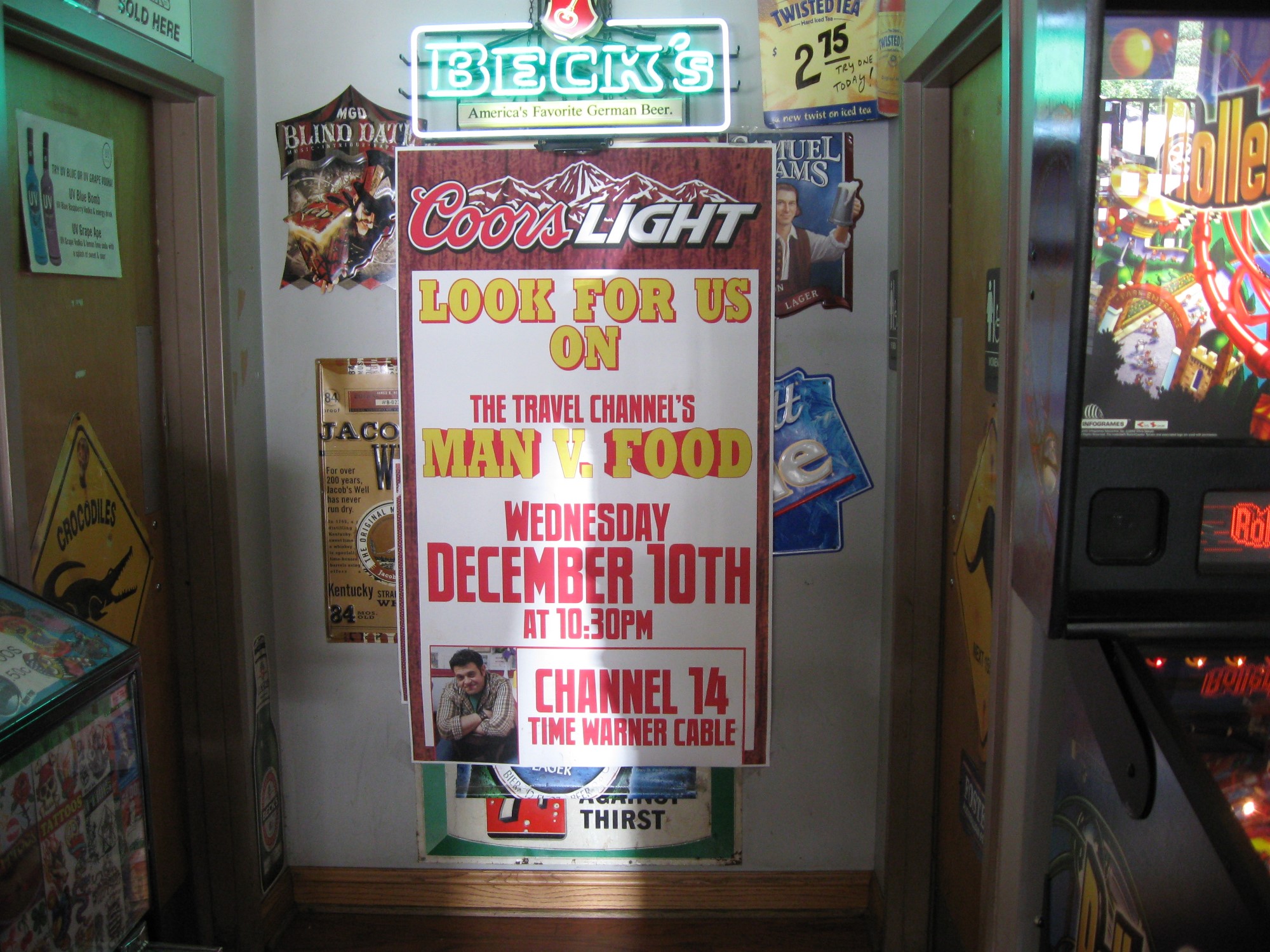 Once our turn came, I understood why we waited. Despite its As-Seen-On-TV claim to fame, the “Cafe” is a bar that only seats 25-30 people, tops. I suspect it only seated 20-25 before the show aired. The narrow walkway between the bar and the only row of booths was further obstructed by a couple more out-of-place tables that didn’t match the others. We had to weave around other families and out-of-place out-of-towners like us in order to squirm into our seats at the one clean table, as promised. The neon beer signs and the flat-screen CRT-TV were standard-issue drinking-hole decor that didn’t reach the level of “charming” we’d dreamed of finding.