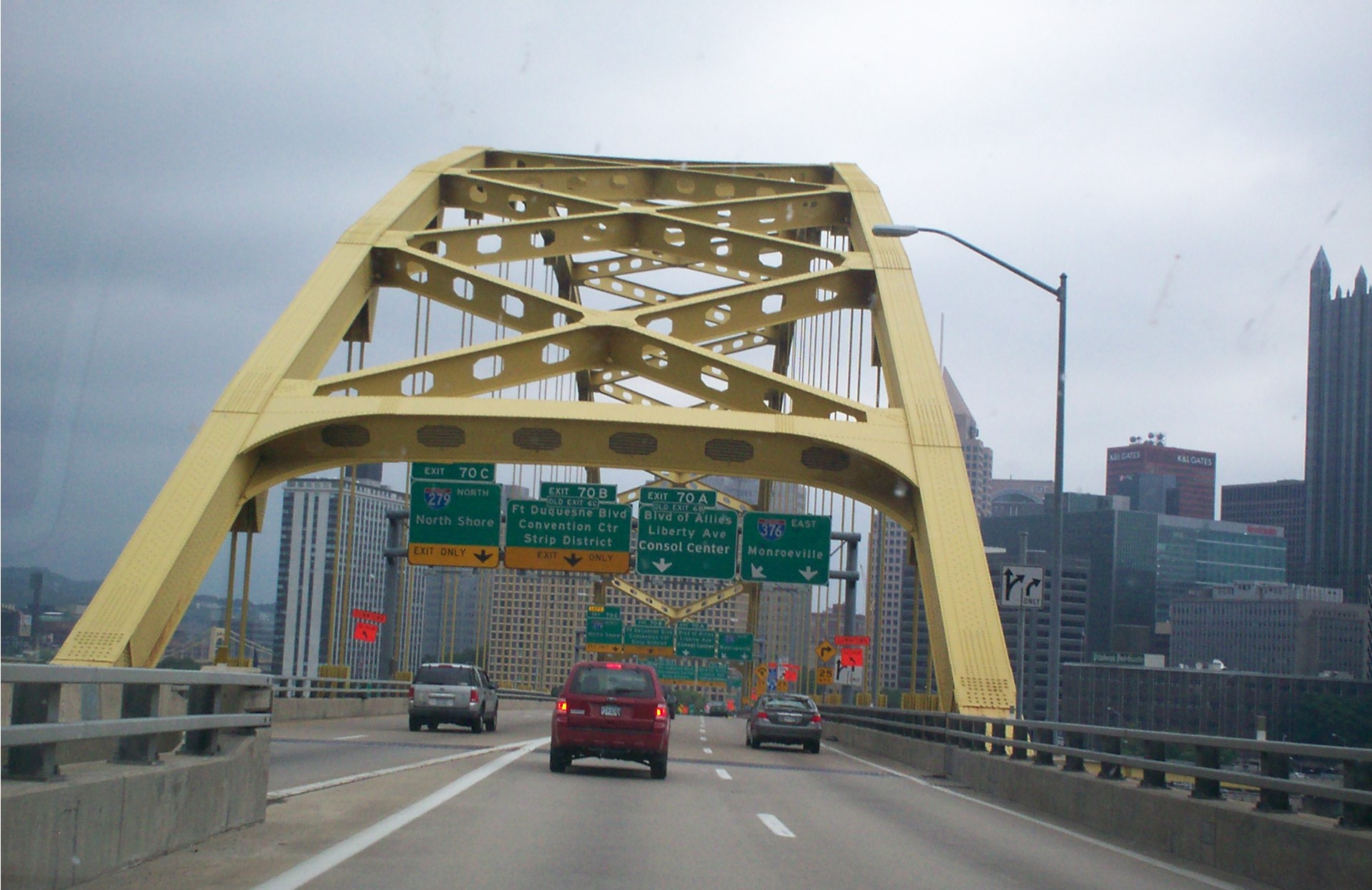 Art in roadside architecture: I-376 across the Fort Pitt Bridge, taking us over the Monongahela River and back into Pittsburgh proper.