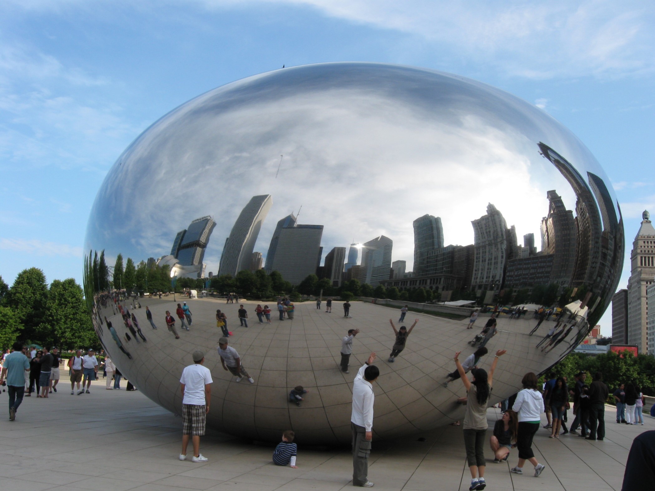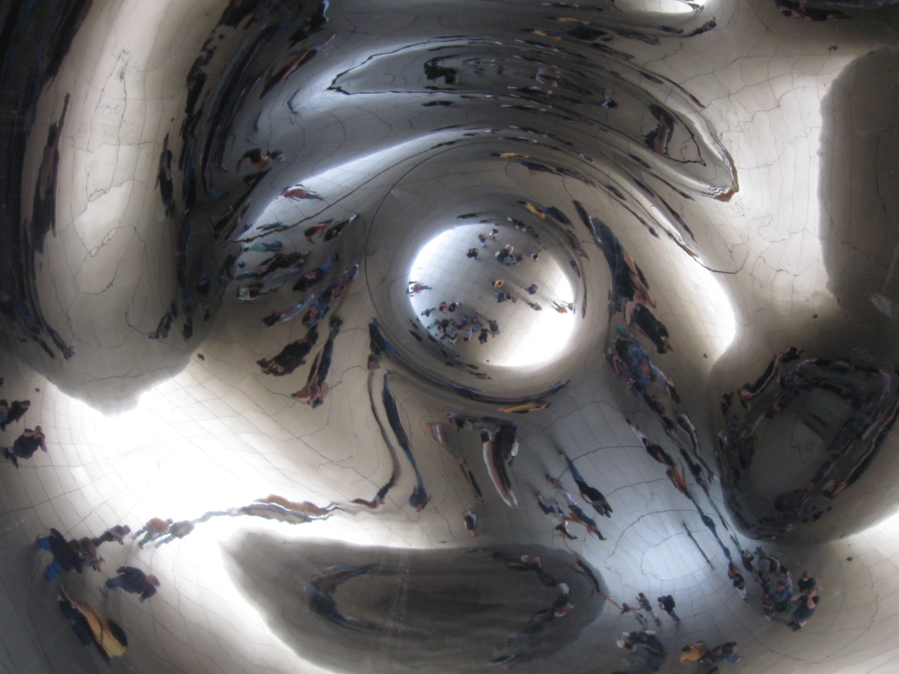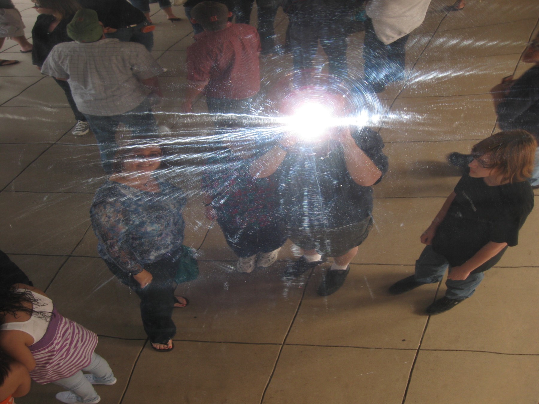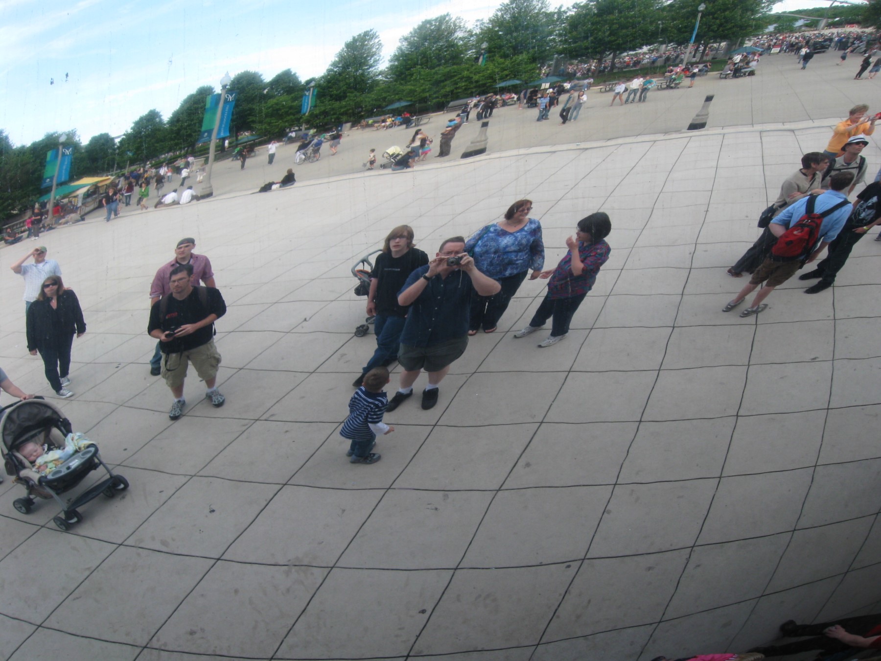 A better look at the tourists huddling under the bean and staring upward into their short, squat reflections.