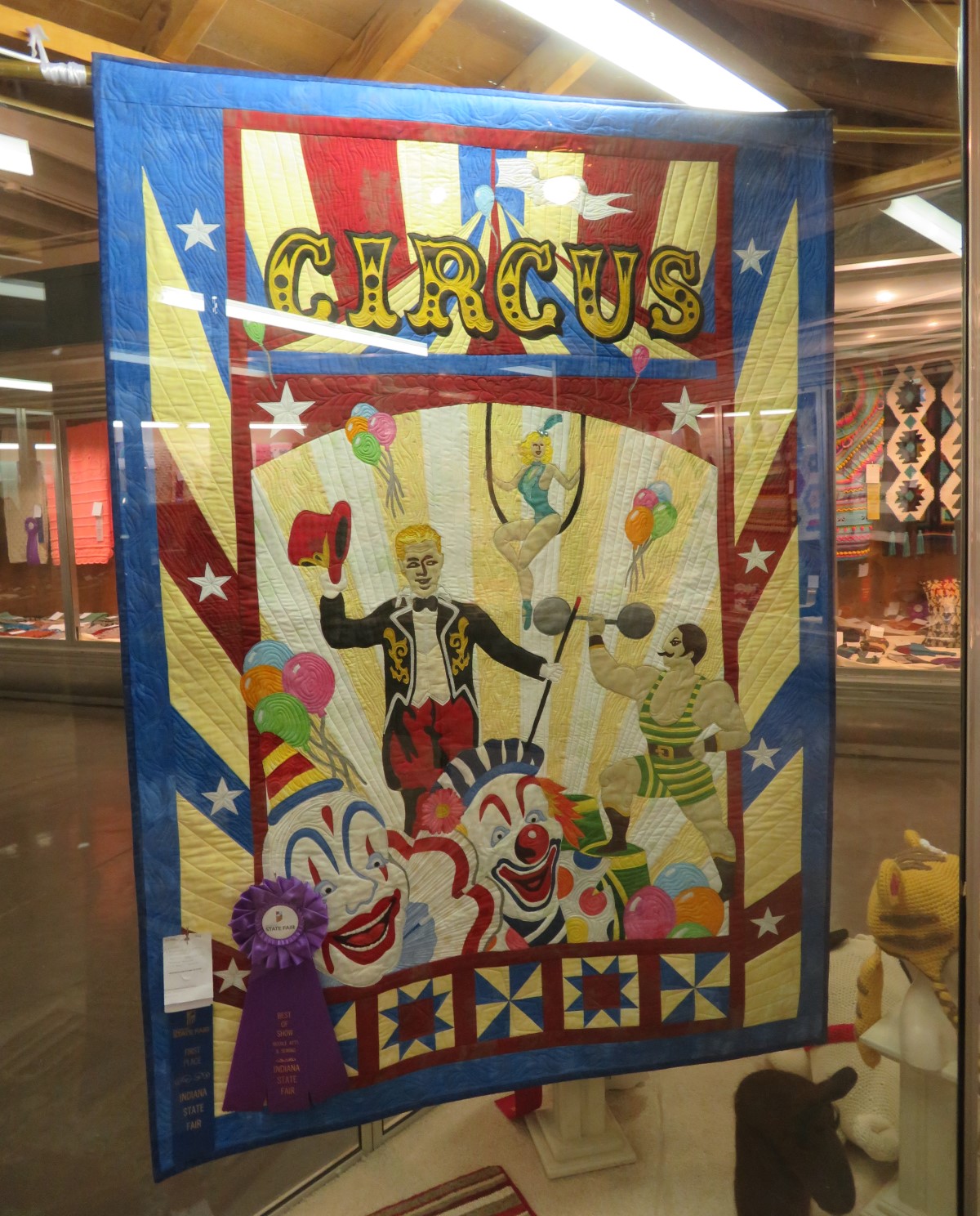 For value-added circus-based fun, the State Fair in conjunction with the Children’s Museum of Indianapolis also offered a special exhibit called “Celebrating Indiana’s Circus History”, with interactive kiosks, children’s activities, historical artifacts, and a large screen playing random scenes from The Greatest Showman. We haven’t seen it yet, so I had to avert my eyes to prevent spoilers. We had plenty of other colorful items to view in the meantime.