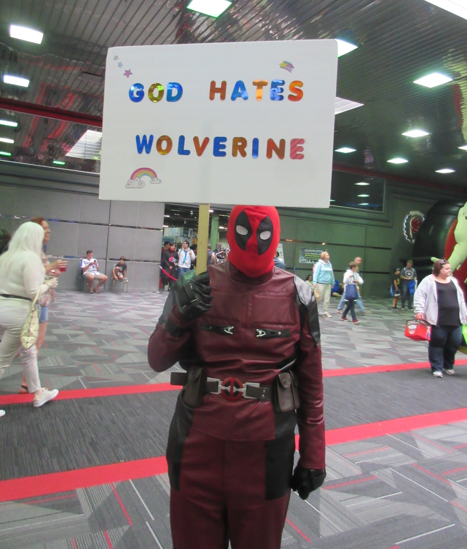 Years into it, the Deadpool cosplay craze still hasn’t died. This one brought his own unicorn pool-pal.
