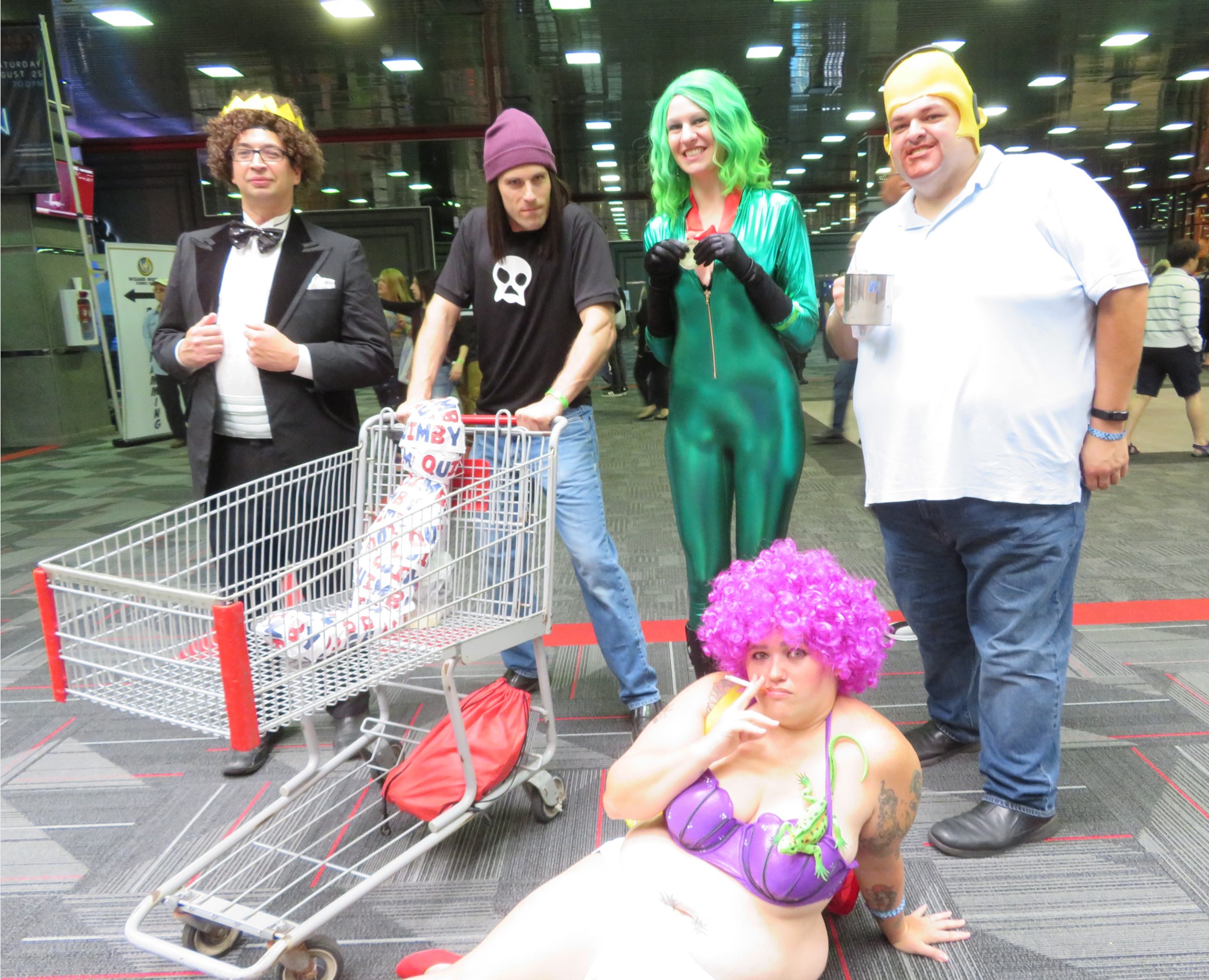 From The Simpsons: Prom King Artie Ziff, Jimbo Jones with Milhouse wrapped in VOTE QUIMBY tape, naturally Homer, and Selma with Jub-Jub. Our best guess on the lady in green is…someone else from Acrobatica Infiniti? Maybe? No?