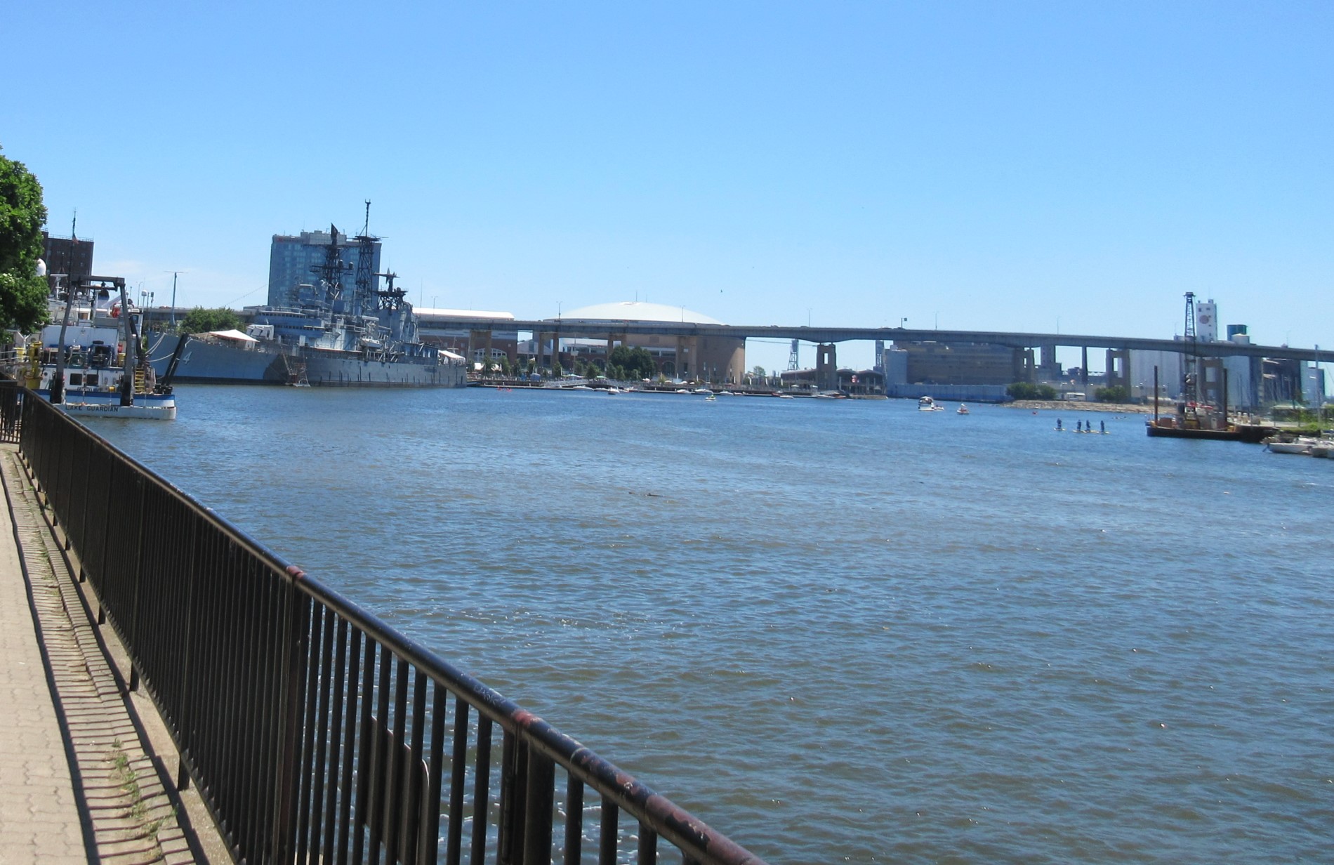The Buffalo River, an original section of the Erie Canal, heading east toward and under the Buffalo Skyway.