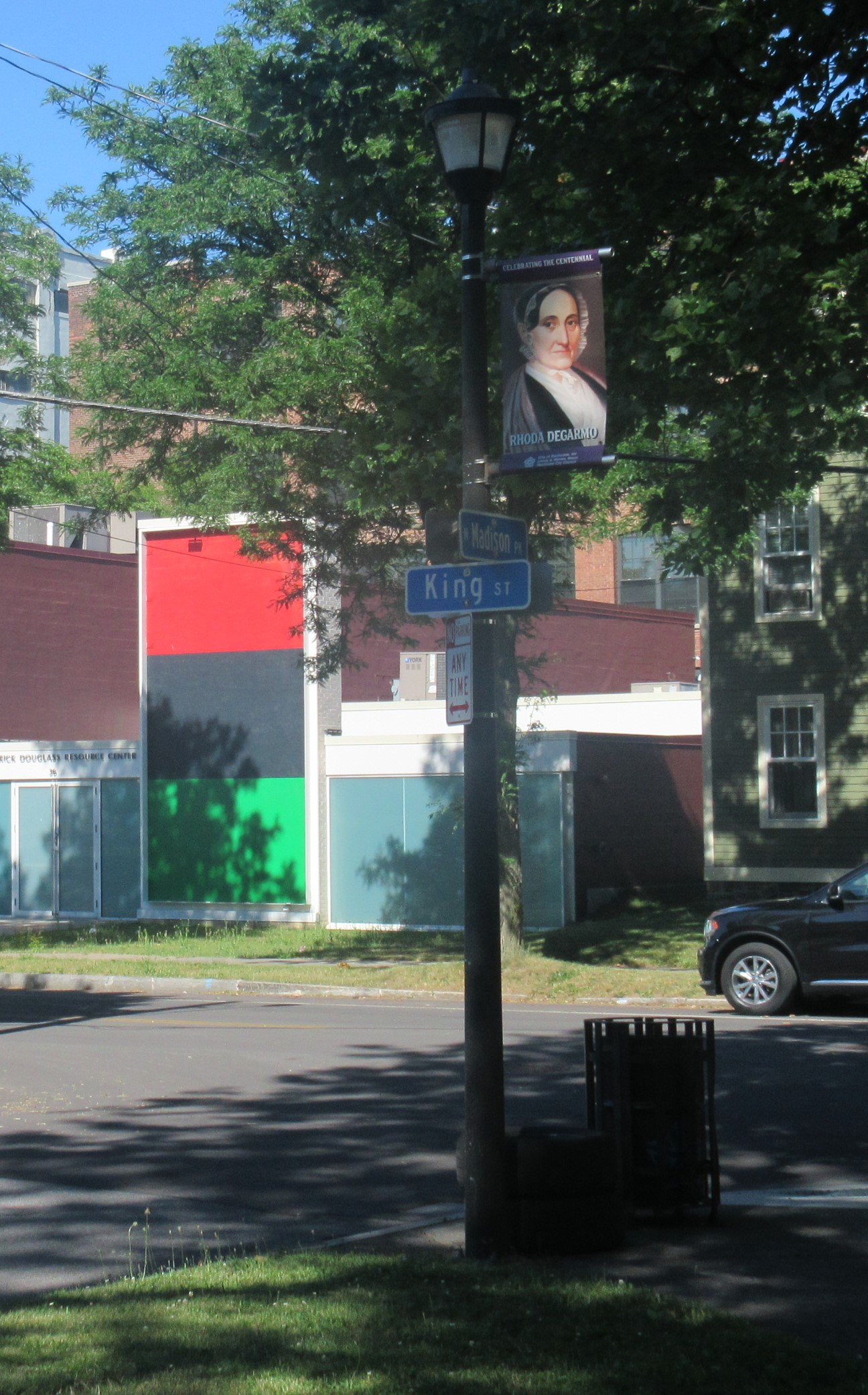Banners saluted a selection of collaborators such as Rhoda DeGarmo, a suffragette who was among those arrested with Anthony after Election Day 1872. She also organized anti-slavery fairs and was part of the Underground Railroad.