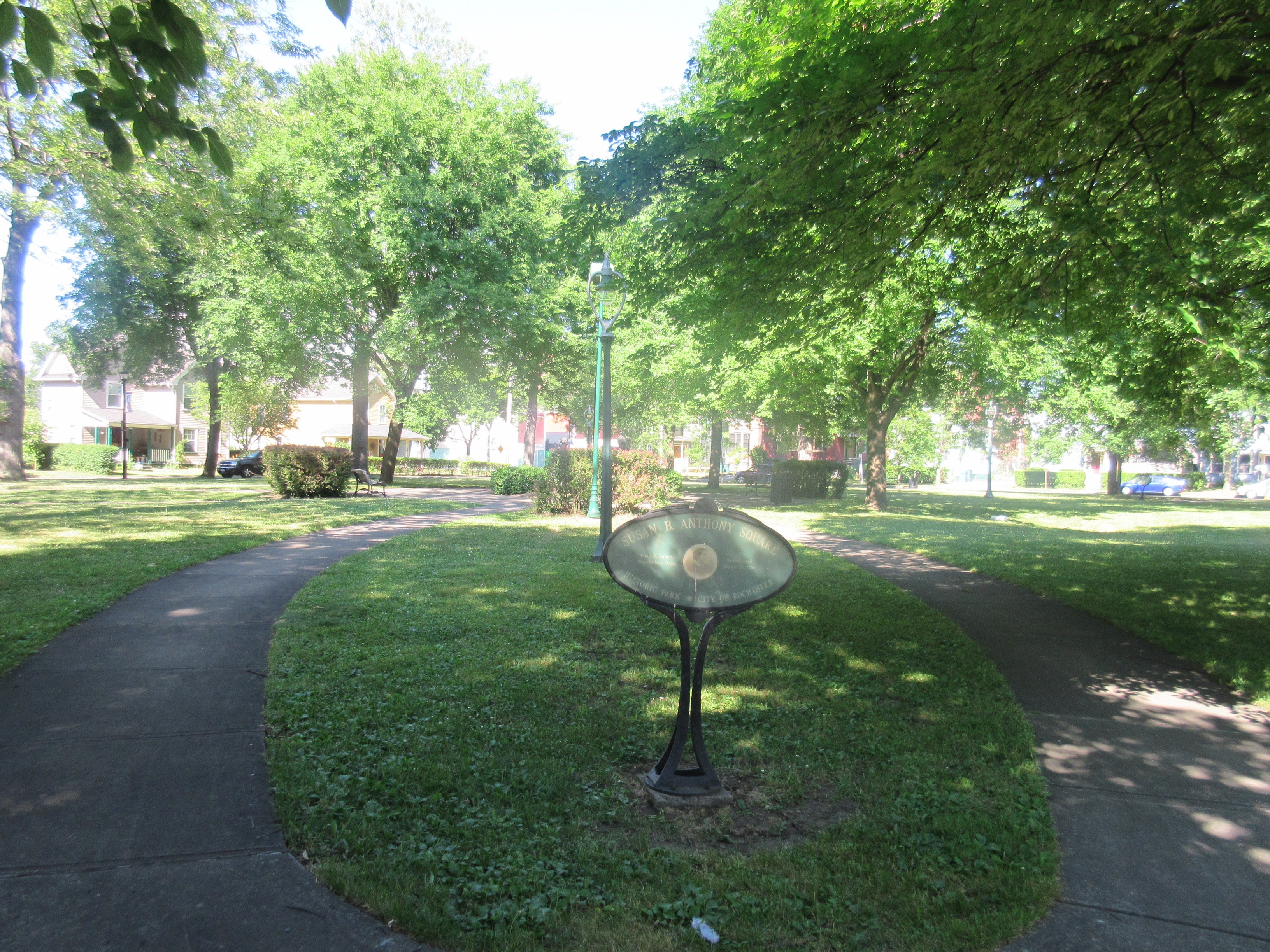 The small park’s centerpiece is the above-pictured pair of bronze statues, a team-up of rights champions entitled “Let’s Have Tea”, the work of Laotian artist Pepsy Kettavong. Most sites indicate a 2001 completion date, but the sign on location reads “1998-2002”. In real life Anthony’s parents introduced her to Douglass, and the two became friends and frequent partners at the same speaking engagements. He was one of many recurring visitors at her house along with other suffragettes, and printed the first copies of his newsletter The North Star in her basement.