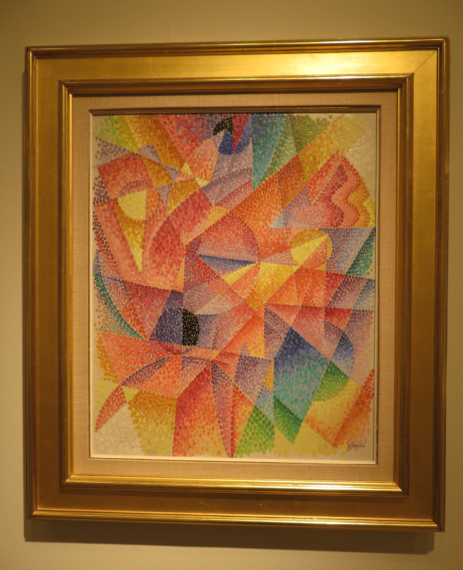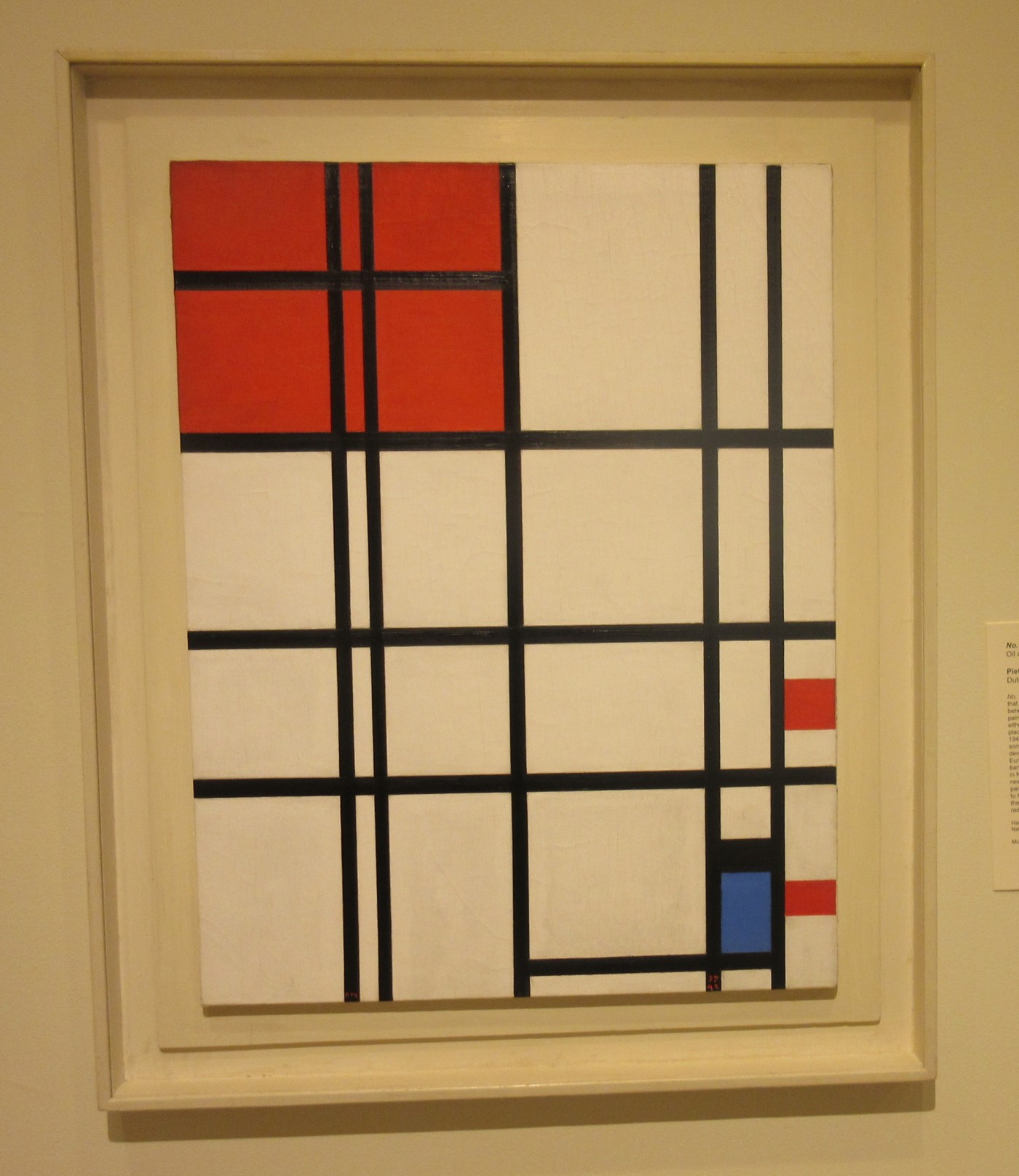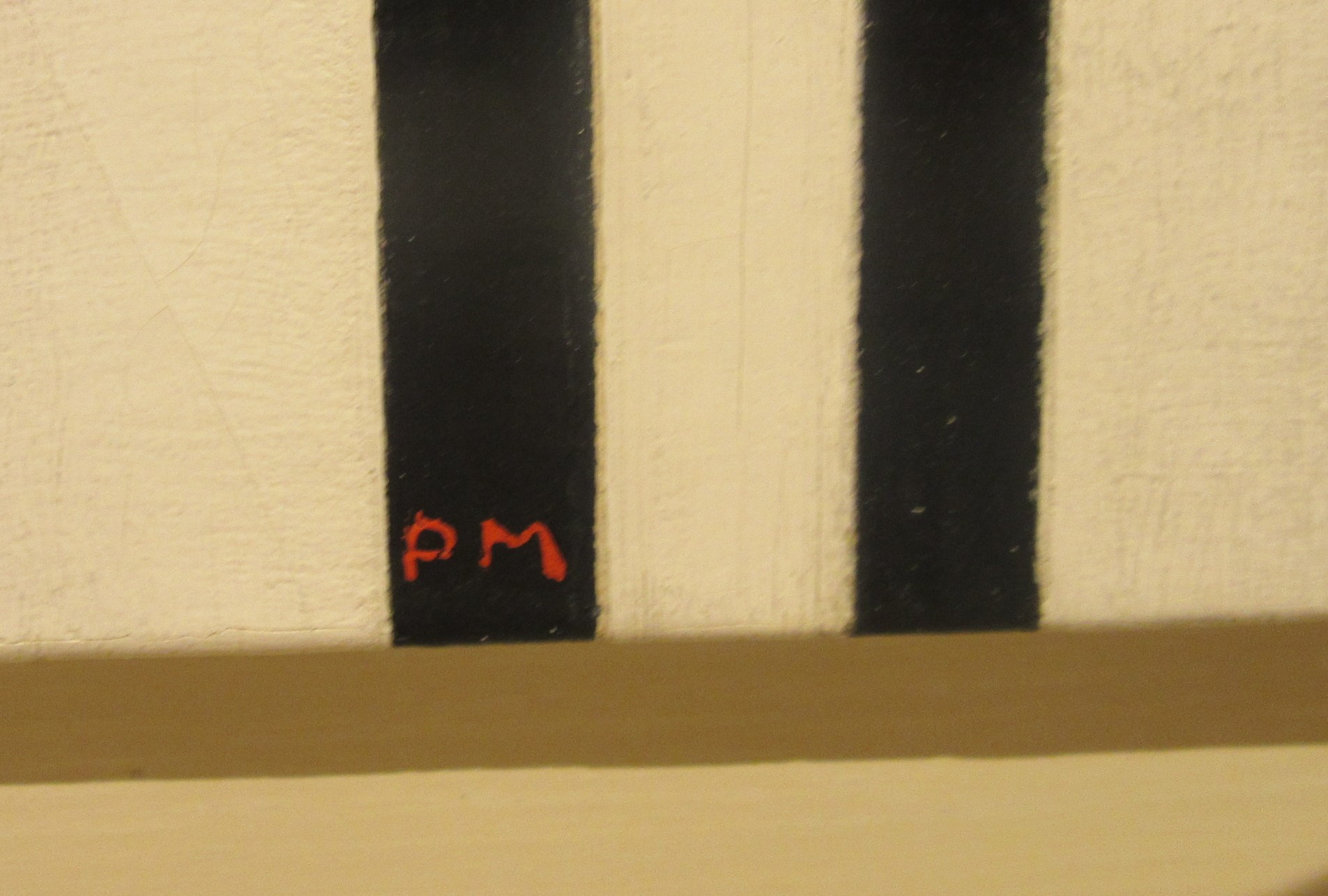 Features nearly imperceptible online include the years written at the bottom of the painting on one side, and Mondrian’s initials on the other.