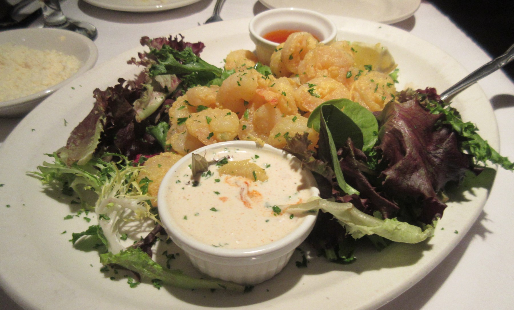 Appetizer: lovely, delicate Rock Island shrimp, served with sweet chili sauce and some other white sauce that paired well with it.