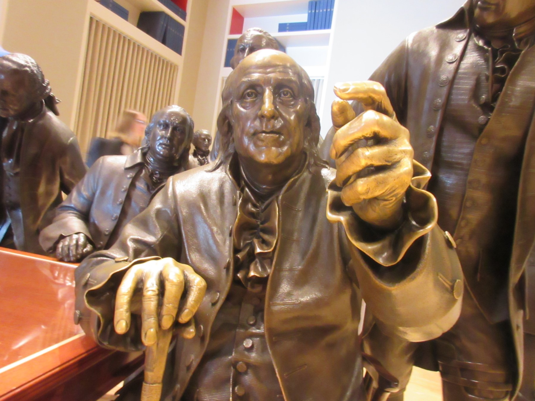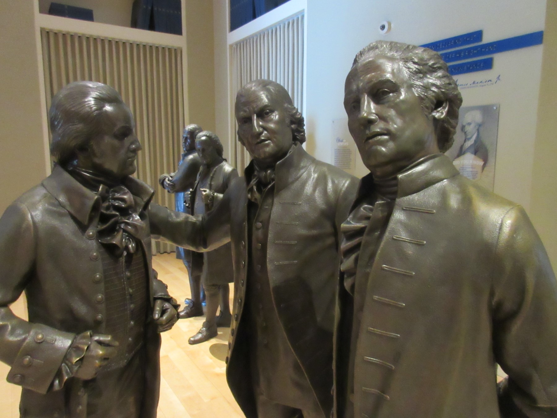 The voluminous main floor of the National Constitution Center was interesting and educational in and of itself, but an unusual display awaited us on the second floor in the George H. W. Bush Gallery, a room in which the momentous signing of the U.S. Constitution takes on real-life proportions and surrounds visitors in history and metal.