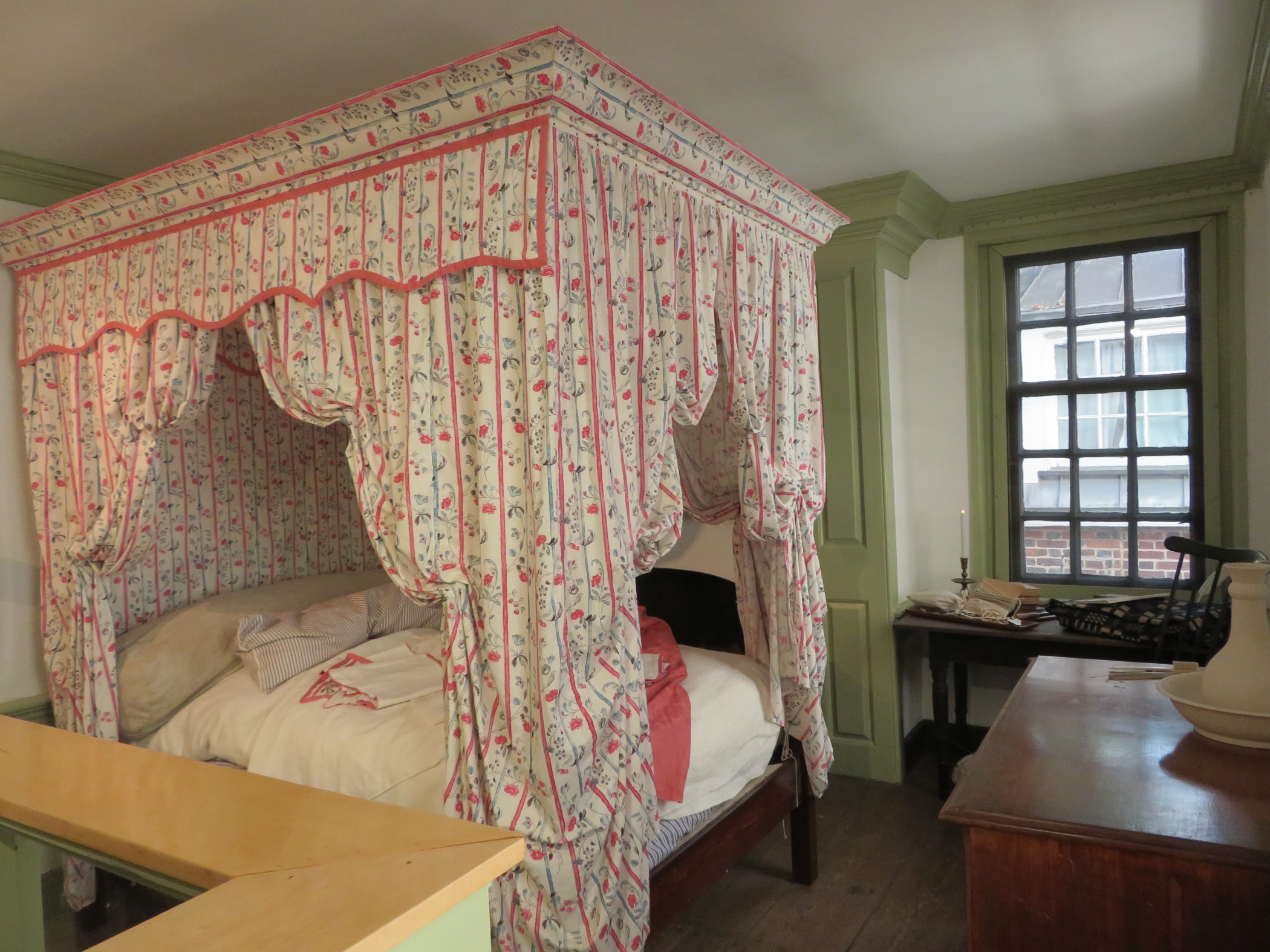 The Widow’s Chamber was the bedroom of her landlord and co-dweller Hannah Lithgow. Recent pains have been taken to restore and replace worn fabrics with newly hand-stitched ones.
