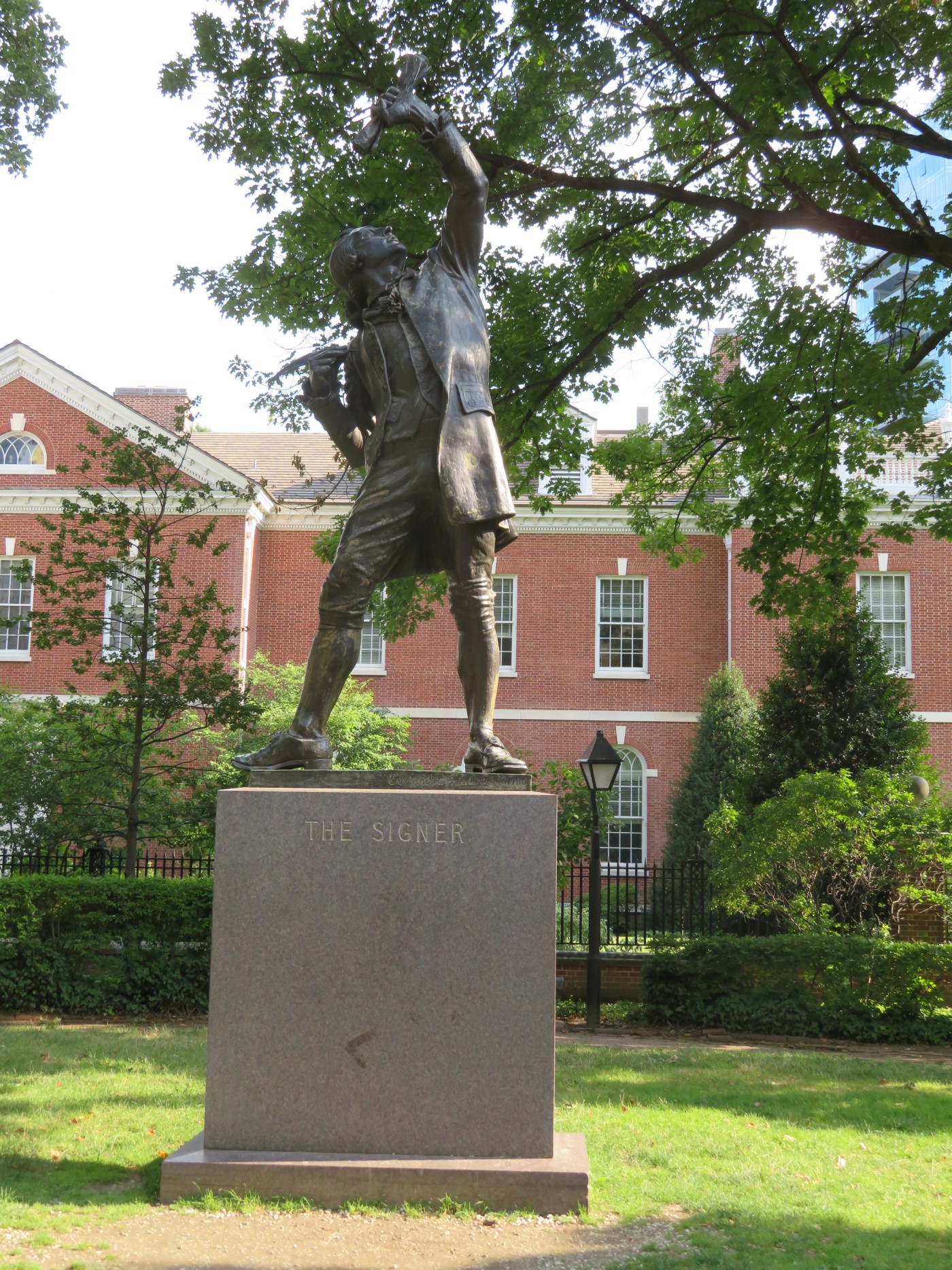 On the Mall and next door to the Hall is Signer Gardens, which we missed last time. On the grounds is the onetime house of artist George Clymer, the man responsible for the ubiquitous George Washington painting that graces our $1 bills. In front of the house stands “The Signer”, a 1982 general tribute to any Founding Fathers who signed documents that helped turn the United States of America into a reality.