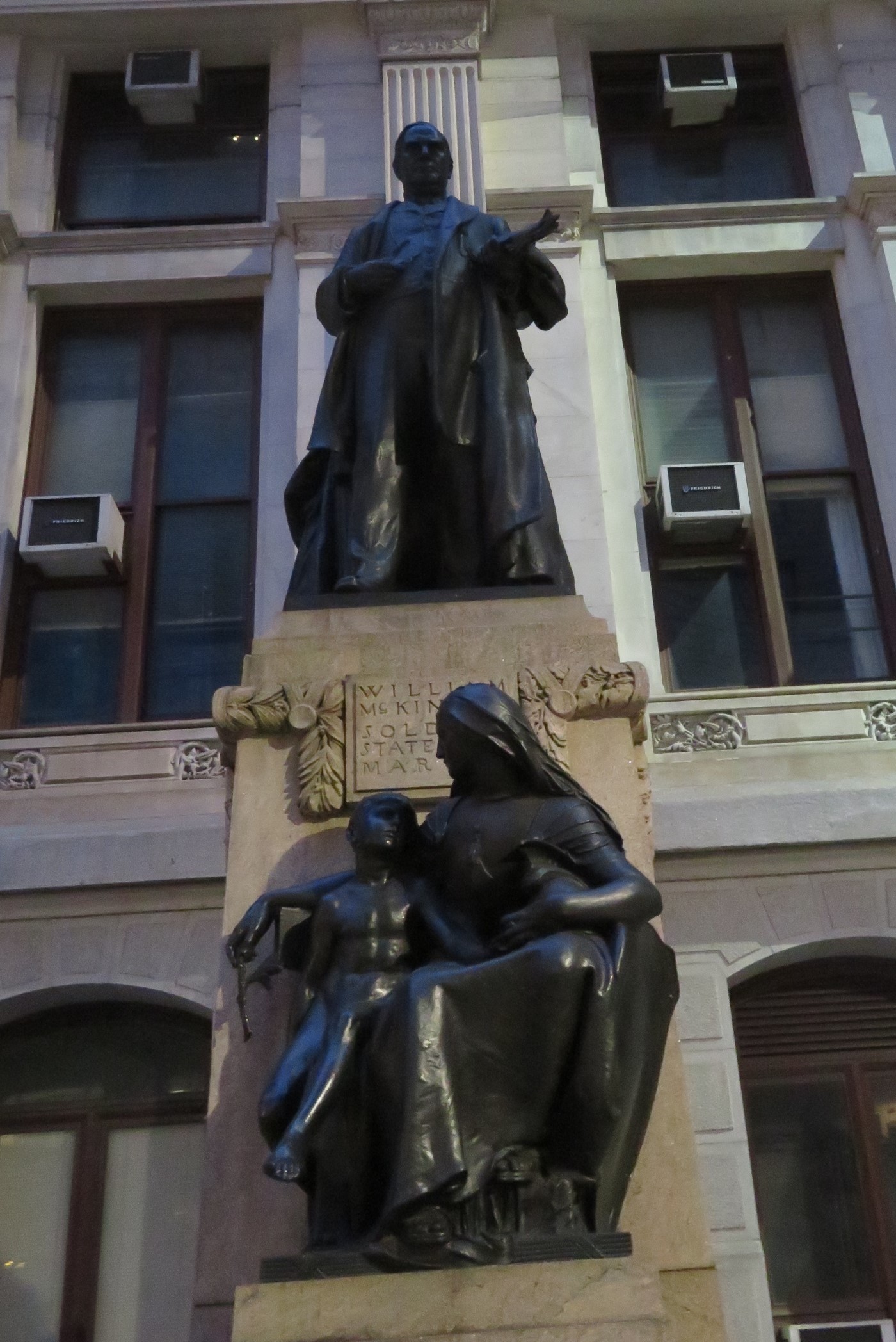 Not our first statue of William McKinley (d. 1901), this 1908 version was designed by Charles Lopez and executed by Isidore Konti. Below McKinley is an avatar of Wisdom educating The Youth.