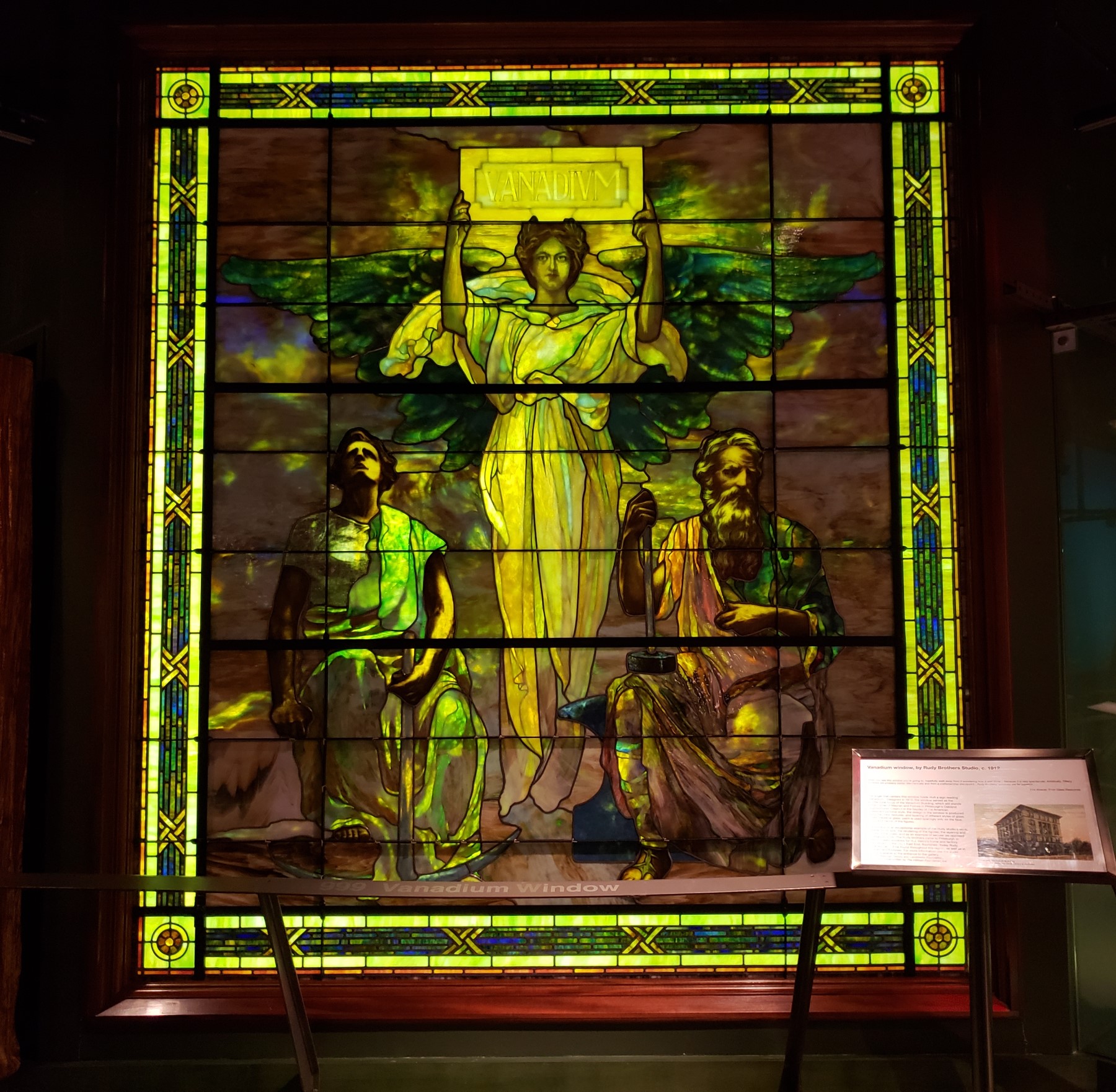 This 1912 stained glass once adorned the Vanadium Building, former headquarters of the nuclear industrialists at Standard Chemical Company.