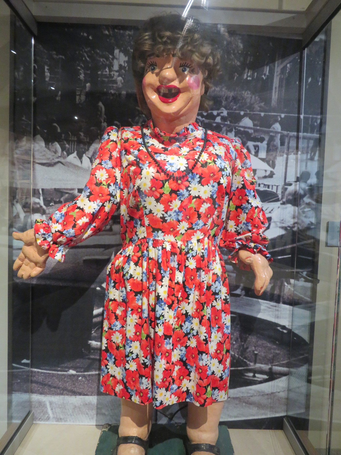 On the opposite end of the fashion spectrum lurks Beulah the Laffing Lady, a figure from some local evil amusement park.