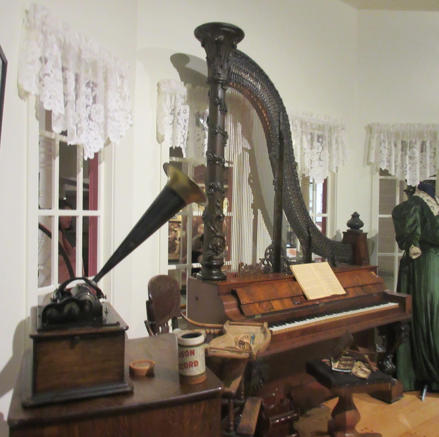Music makers from way back when such as the Thomas Edison phonograph and the Transitional Piano, the evolutionary link leading from harpsichords and grand pianos to upright pianos.