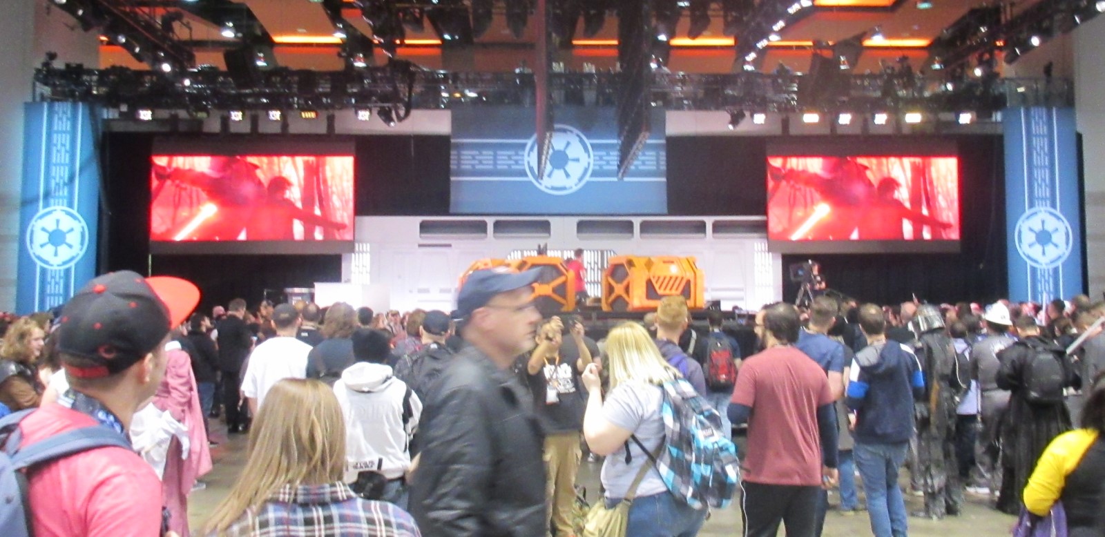 - Watch the presentation and trailer live on kindasorta big screens at the Star Wars Live Stage in the middle of the exhibit hall with thousands of fellow losers, obstructions, and complete lack of acoustically useful accommodations, by which I mean lots of loud noise and poor speakers