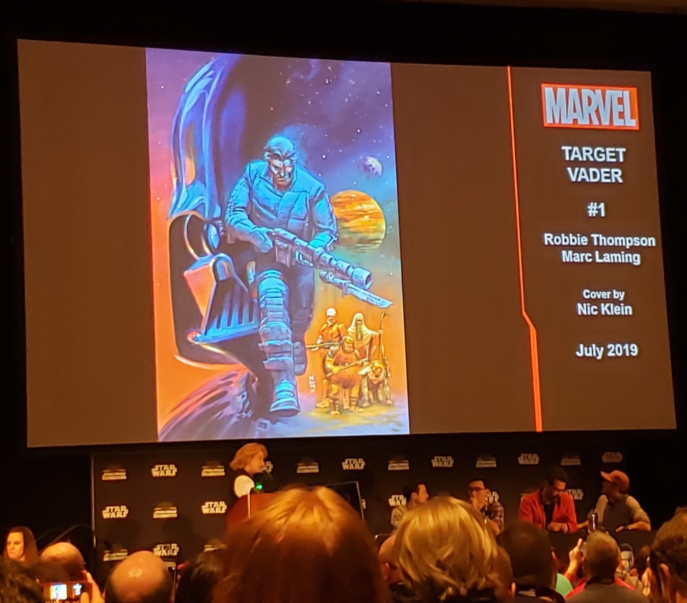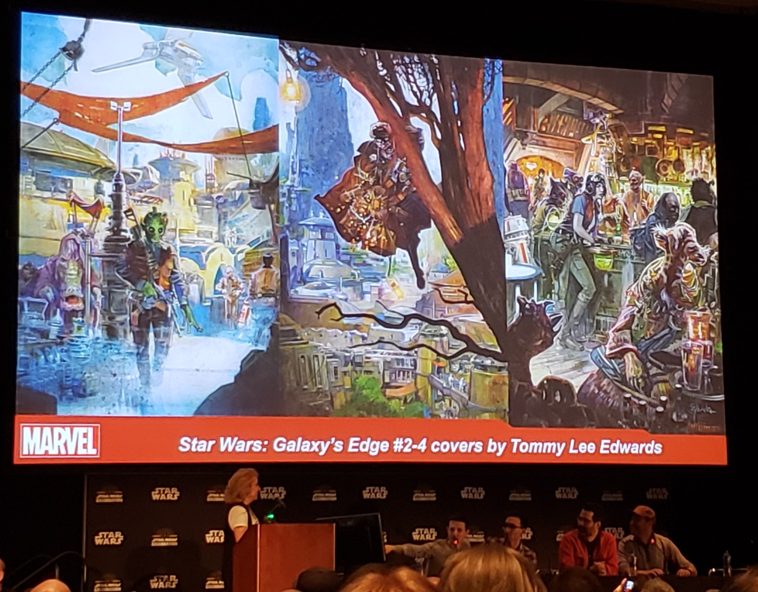 Our panelists were Matt Martin from the Lucasfilm Story Group, overlords of the New Canon; Tom Groneman, assistant editor on Marvel’s Star Wars line; writer Greg Pak, whose “Age of Rebellion” specials kicked off in April; and writer Ethan Sacks, in charge of the upcoming Galaxy’s Edge miniseries advertising the big Disney Theme Parks additions (a bit more about those in a future entry). Later in the hour they also welcomed cover painter John Tyler Christopher. Our moderator was Dr. Christy Blanch, an Indiana professor, writer, comic shop owner, and superfan whom we’ve seen and met at previous cons (here, there, everywhere, and then some). The quintet had fun sharing Marvel’s next several months’ worth of Star Wars comics and the great-looking art that’ll be supporting them.