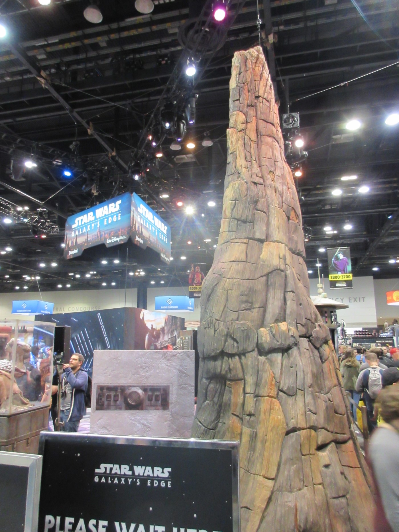 In the center of the show floor was the super-sized space devoted to Galaxy’s Edge, the new, immersive Star Wars sections coming soon to Disneyland and Disney World. Fans will (I’m guessing) be able to walk through familiar alien worlds, step aboard starship recreations, and/or drink at a cantina and see who can shoot whom first. Our chances of traveling to California within the next five years are slim to none, but Florida is slightly more probably, somewhere in the 500,000-to-1 range. Not really sure. But they tried their best to sell us on it.