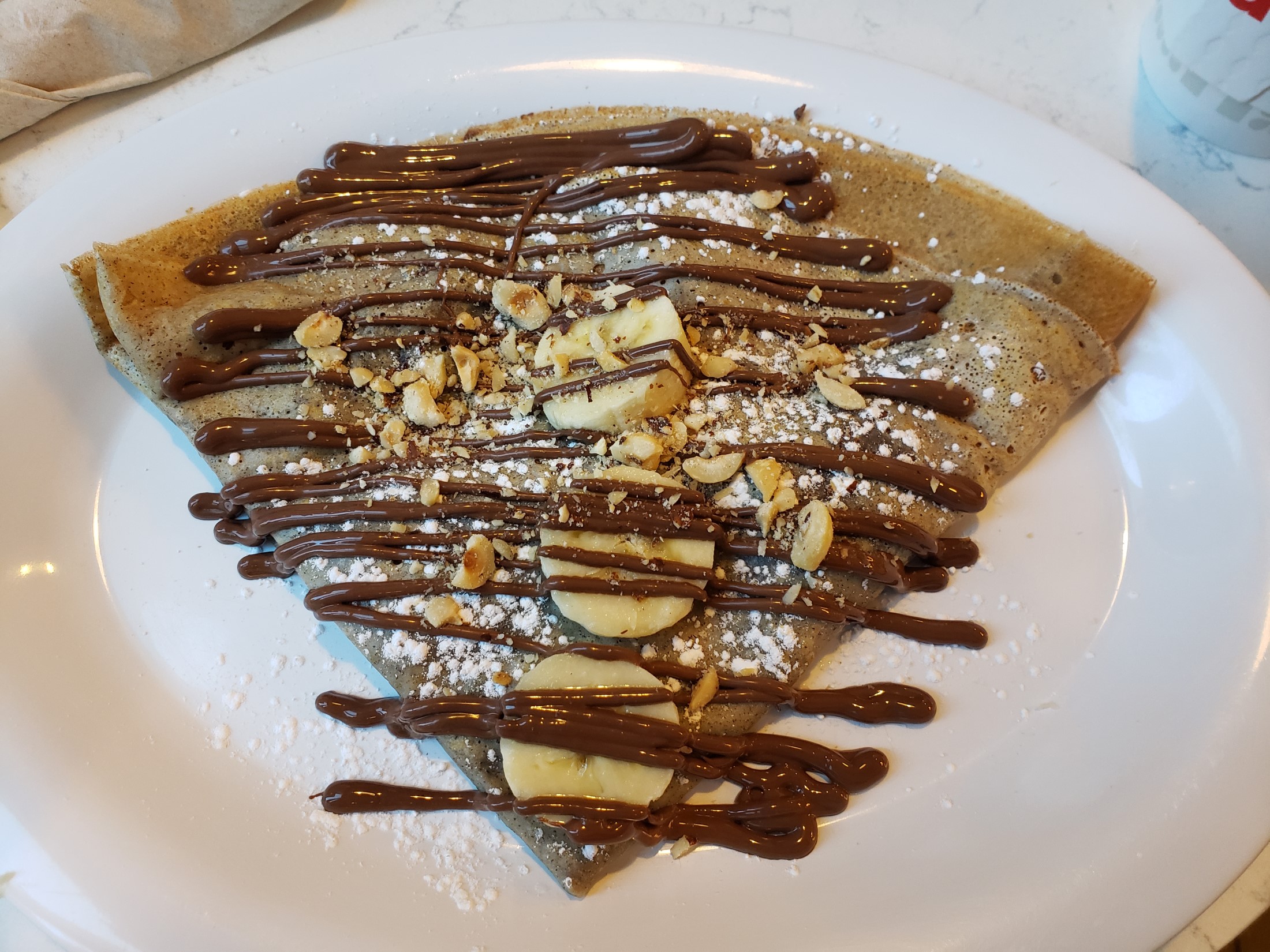 Nutella buckwheat crepe with bananas and fresh hazelnuts. Between the fruit and the unappealing buckwheat color, I’m pretty sure this counts as diet food.