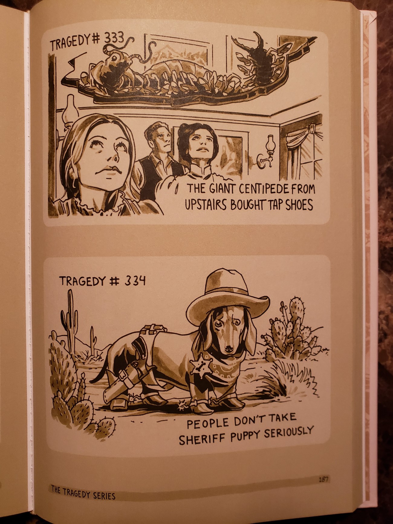 4. Ben Dewey, The Complete Collection of the Tragedy Series: Secret Lobster Claws and Other Misfortunes. Before gracing printed pages in such series as The Autumnlands and Beasts of Burden, artist Ben Dewey wowed followers with a long-running Tumblr devoted to handcrafted artisan single-panel depictions of cosmic ironies and total bummers rooted in the fantastical and the whimsical. The series has concluded, but this handsome hardcover represents all 501 tragedies, a bonus short story, and twenty-six “Sadness Reprieves” interspersed throughout the run, happy moments and little victories to alleviate the wearying oppression of a broken universe that plots against us and/or loves to make us look stupid. I crave artwork like Dewey’s that’s unafraid to add shades and dimensions in vivid black-and-white, and I remain grateful for the custom bookplate that was drawn before my very eyes with my in-person purchase.
