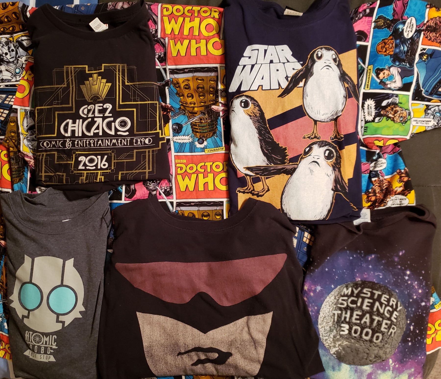 Today was spent preparing with last-minute errands, consolidating and narrowing our to-do lists, and final packing of the necessaries, by which I mean con gear. Want lists. Photo-op tickets. Badge pickup cards. Comics to be autographed. Bottled waters. And yes, T-shirts. As a pair of pear-shaped, lightly graying fogies venturing into new territory, we have to do something to look presentable, blend in, and, Lord willing, eventually feel right at home.