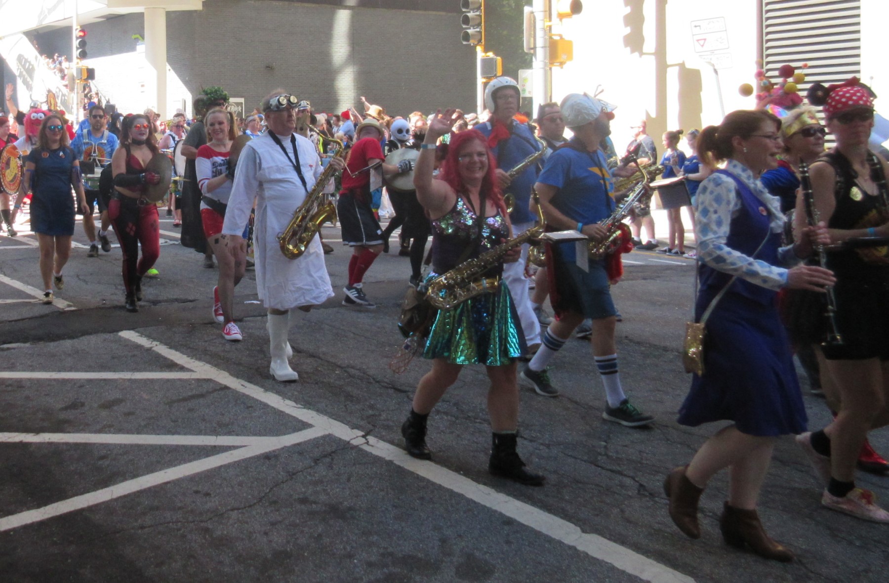 Brass and woodwinds from the Seed and Feed Marching Abominable, featuring Poison Ivy, Harley Quinns, Dr. Horrible, et al.