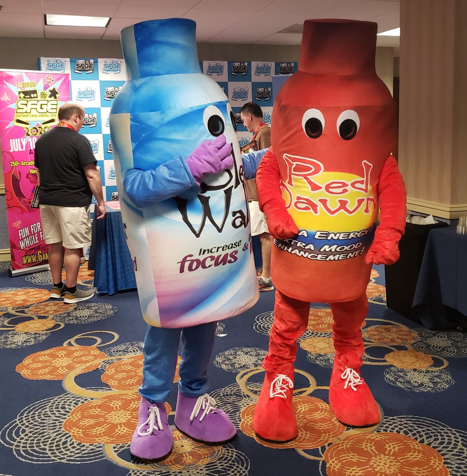Brothers in bottles: these two pitchpeople for legal energy boosters were the very first cosplayers we encountered on D*C turf, around the corner from the badge pickup ballroom.