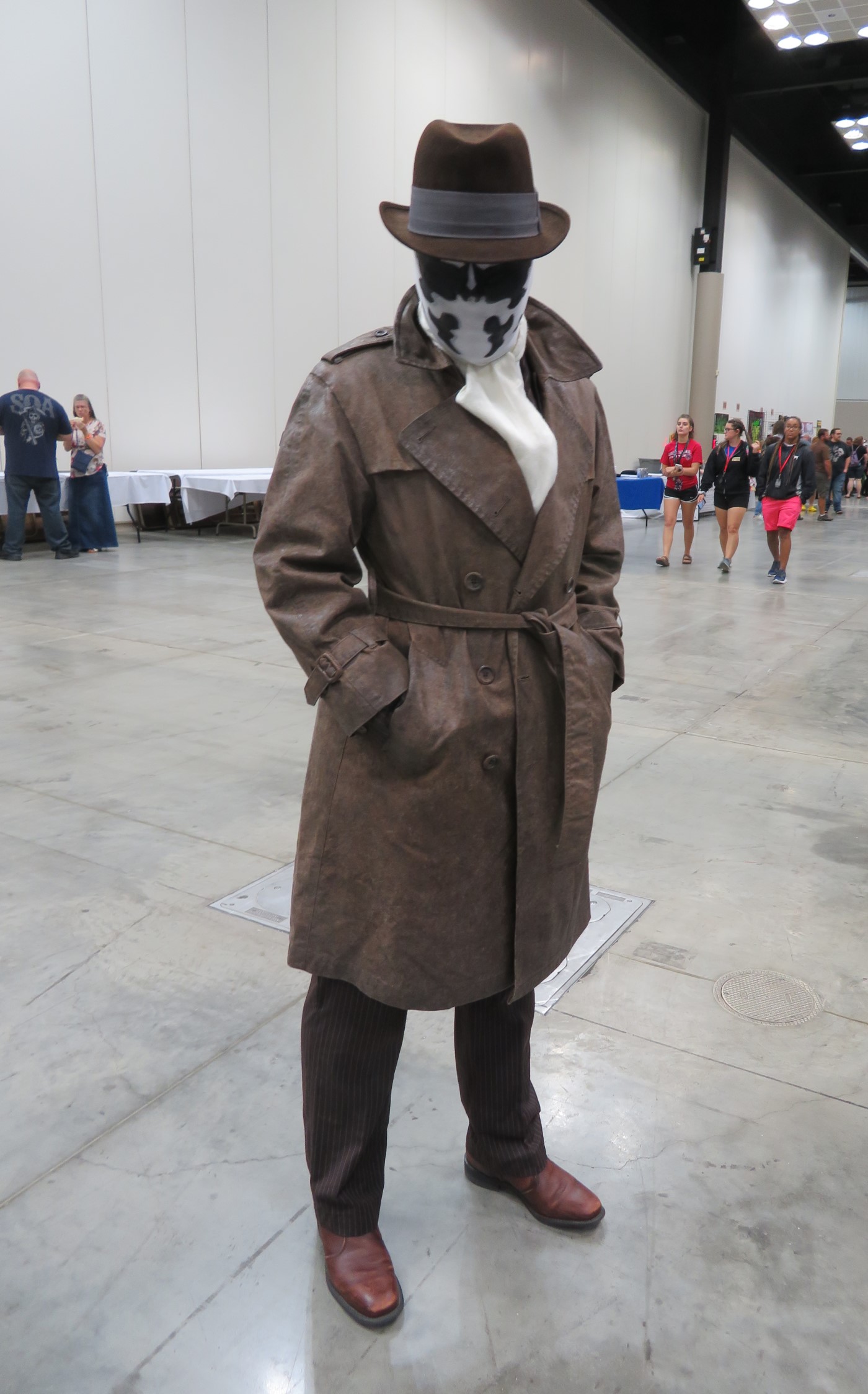 The show’s celebrity aspects went relatively okay, apart from when there was an unexplained half-hour delay in photo ops in the late afternoon. Also, at one point earlier, the autograph lines near us stopped as Gugino, Wilson, and a handler gather to huddle around their phones for a few minutes. My first thought was, “Please tell me they didn’t just learn their checks bounced and they’re all walking out right now.” That didn’t happen, though at one point Gugino ran two tables down to confer with fellow guest and Watchmen costar Jackie Earle Haley. Eventually they stopped huddling and whispering, and they resumed chatting and signing stuff. Kinda weird for a bit there, though.
